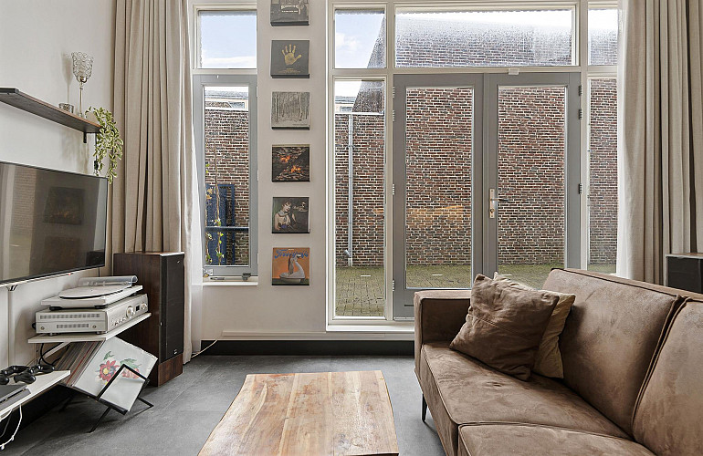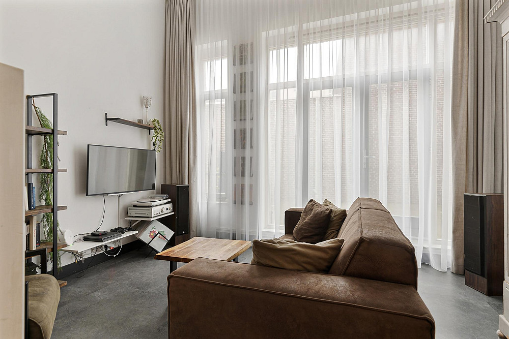Woon-/eetkamer: Lichte en open leefruimte met grote ramen en openslaande deuren voor een prettige sfeer en een vaste trap naar de entresol. De woonkamer heeft een plafondhoogte van 4 meter waardoor deze extra ruim is.