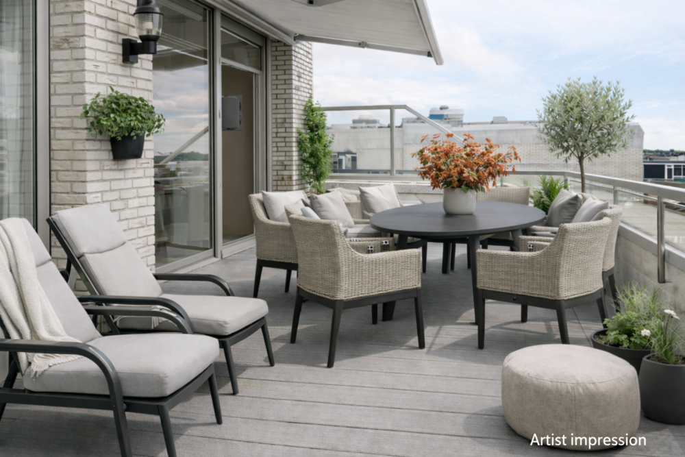 Een hoogtepunt is het riante terras van circa 22 m² aan de voorzijde, gunstig gelegen op het zuidoosten. Dit zonnige terras grenst direct aan de woonkamer en biedt een uniek uitzicht over Noordwijk. Dankzij de royale afmetingen is er meer dan genoeg plaats voor een grote eettafel, een loungehoek en groene beplanting. Hier geniet u van de ochtendzon tot in de middag, de frisse zeelucht en het weidse uitzicht – een perfecte plek voor lange zomeravonden of om gasten te ontvangen. Daarnaast beschikt het appartement over een tweede, kleiner terras aan de achterzijde, ideaal gelegen voor de avondzon.