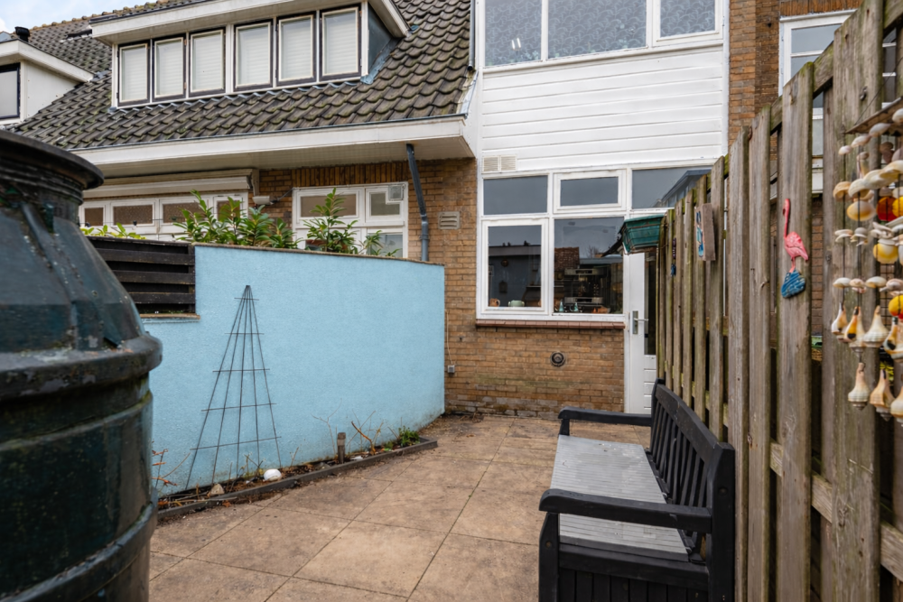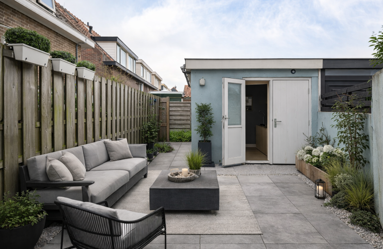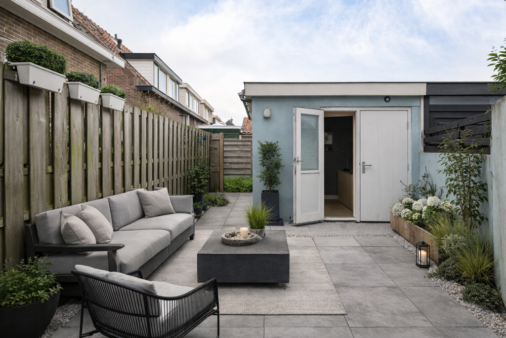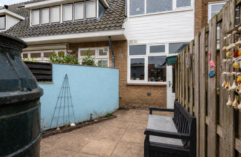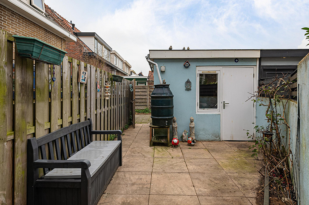 - Achtertuin op het noordwesten met achterom en stenen berging