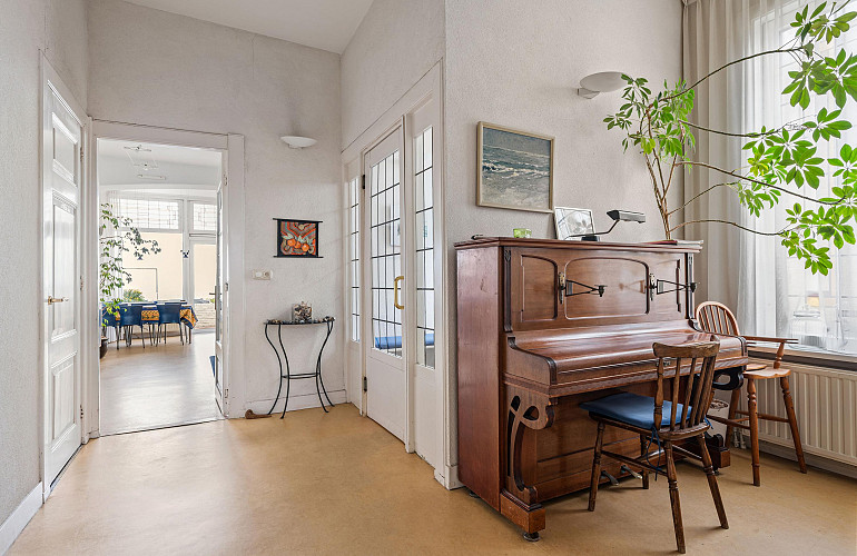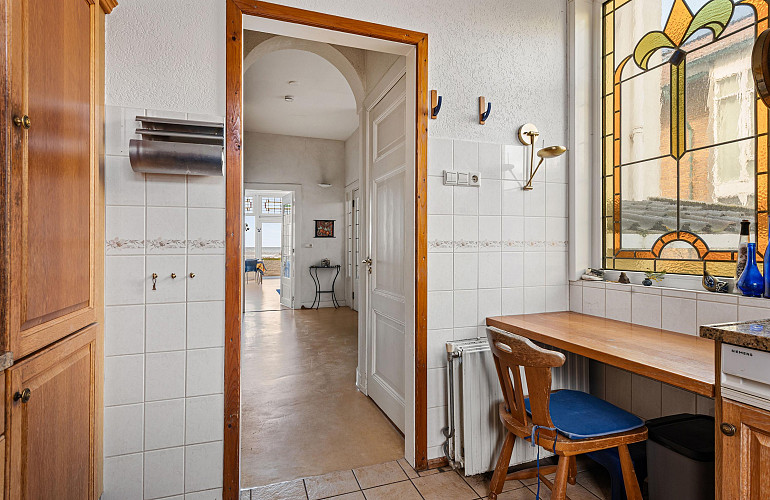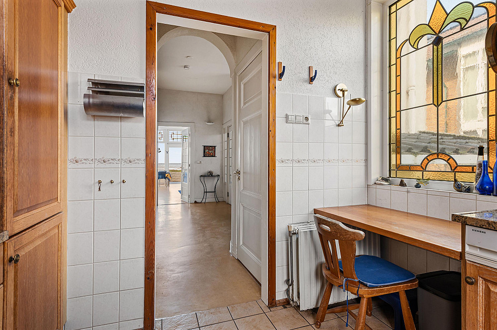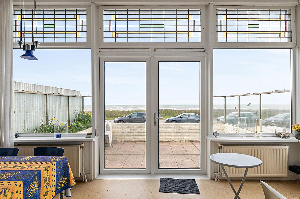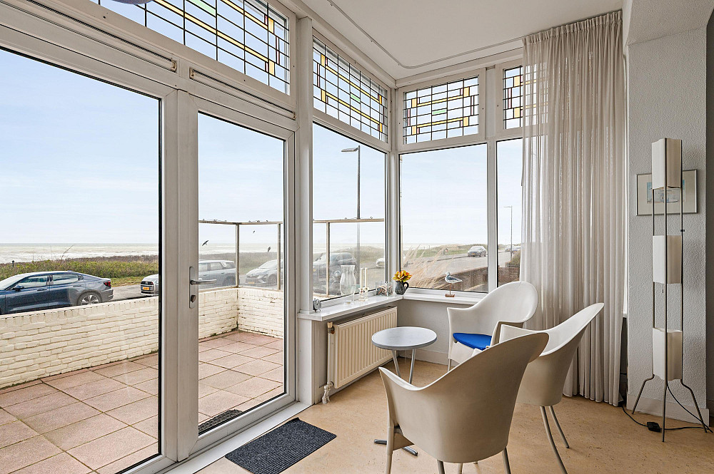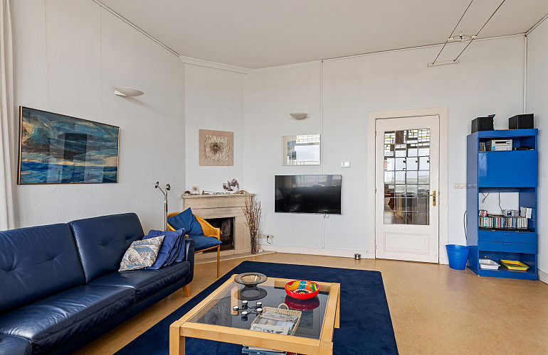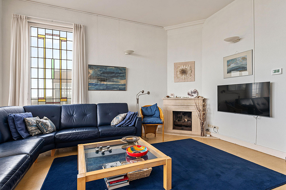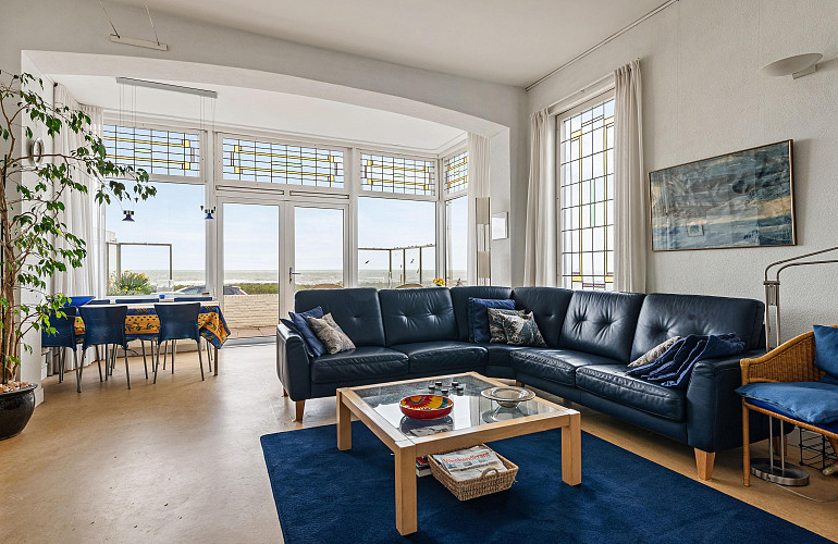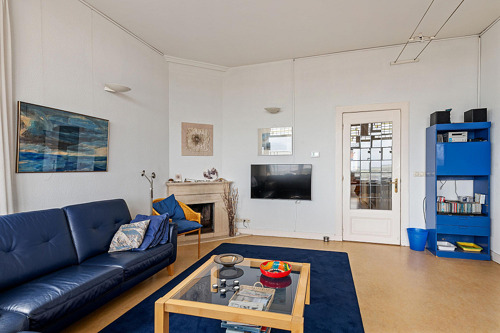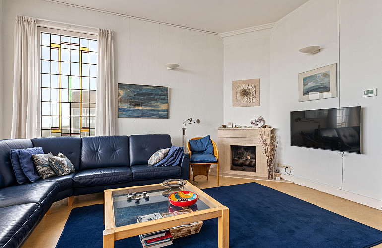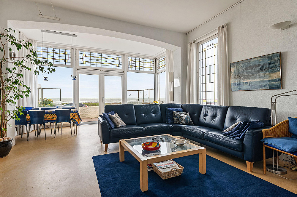 De royale woonkamer van ca. 36 m² is een bijzonder lichte en sfeervolle ruimte dankzij de grote raampartijen aan de voorzijde, de hoge plafonds en de karakteristieke glas-in-loodramen. Vanuit de woonkamer heeft u een prachtig en vrij uitzicht over de boulevard, het strand en de zee. De woonkamer is voorzien van een betonnen vloer met comfortabele vloerverwarming.