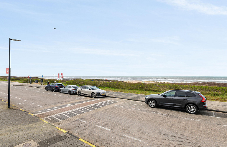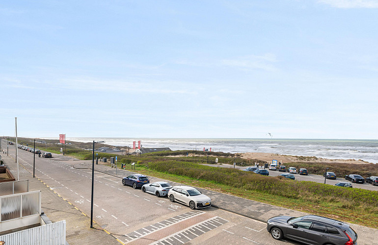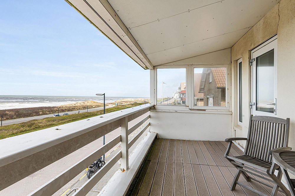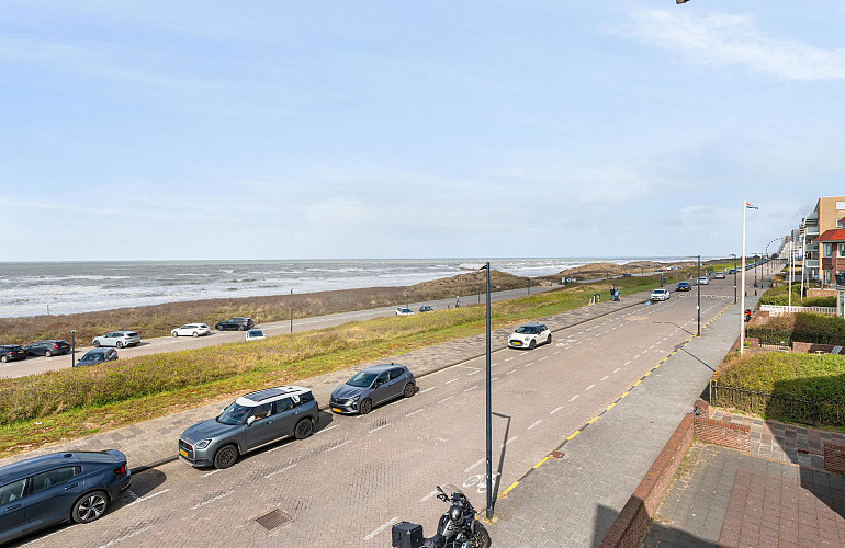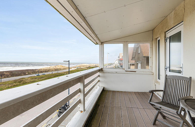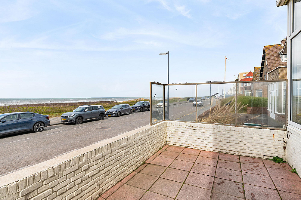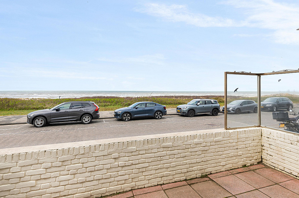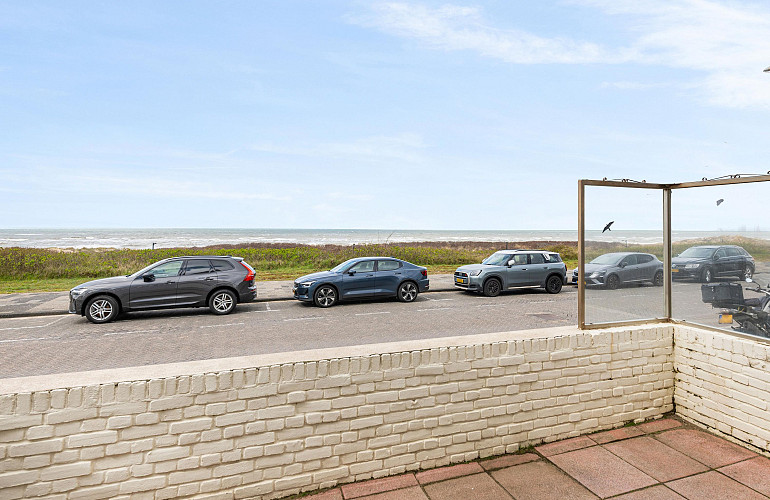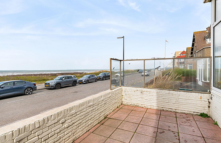 Via openslaande deuren vanuit de woonkamer bereikt u het ruime terras aan de zeezijde van ca. 13 m², gelegen op het westen. Dit terras vormt een verlengstuk van de woonkamer en is een heerlijke plek om buiten te leven met het strand en de zee letterlijk voor u. Door de ligging op het westen kunt u hier vanaf de middag tot in de avond genieten van de zon. Terwijl de boulevard langzaam rustiger wordt en de lucht boven zee verkleurt, zit u hier op een unieke plek om te genieten van de ondergaande zon.