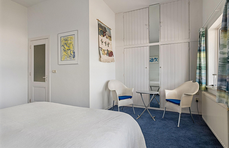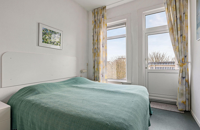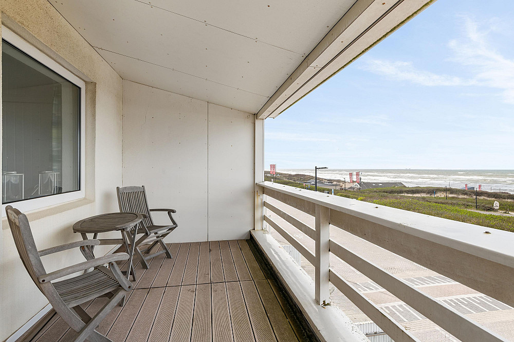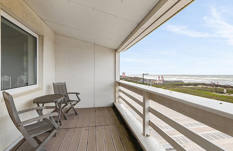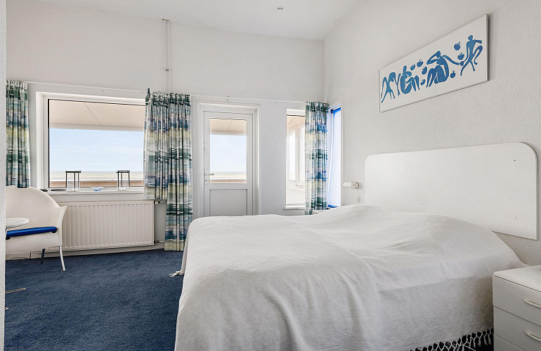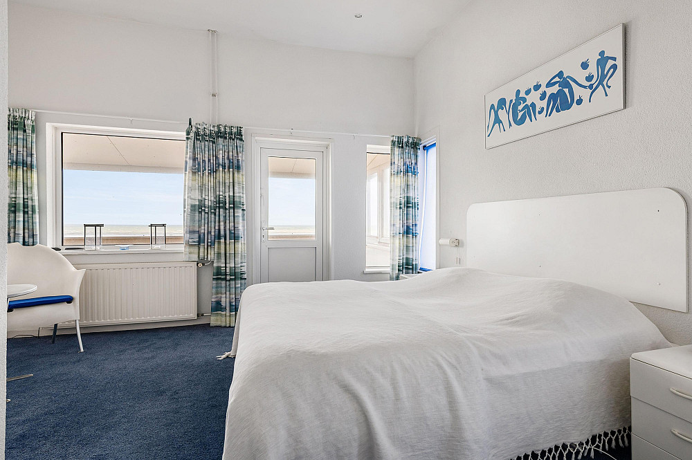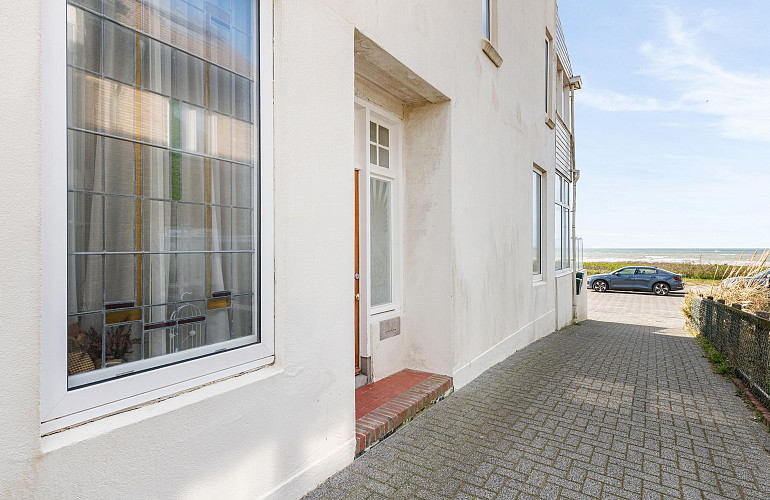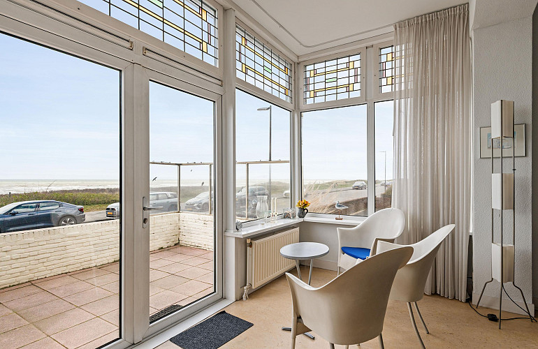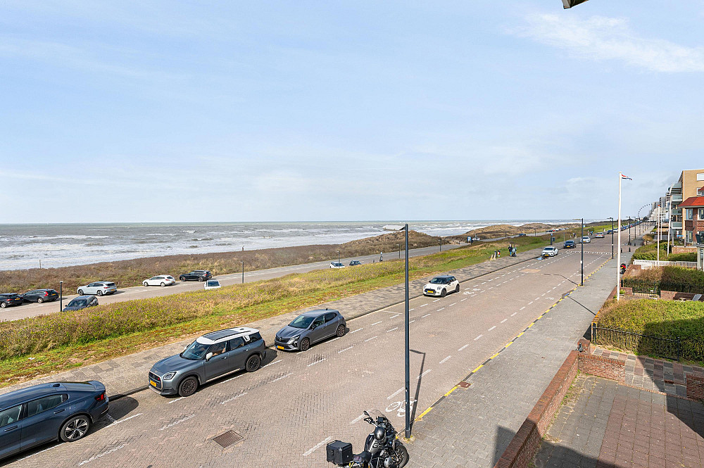 Via openslaande deuren vanuit de woonkamer bereikt u het ruime terras aan de zeezijde van ca. 13 m², gelegen op het westen. Dit terras vormt een verlengstuk van de woonkamer en is een heerlijke plek om buiten te leven met het strand en de zee letterlijk voor u. Door de ligging op het westen kunt u hier vanaf de middag tot in de avond genieten van de zon. Terwijl de boulevard langzaam rustiger wordt en de lucht boven zee verkleurt, zit u hier op een unieke plek om te genieten van de ondergaande zon.