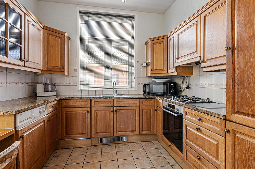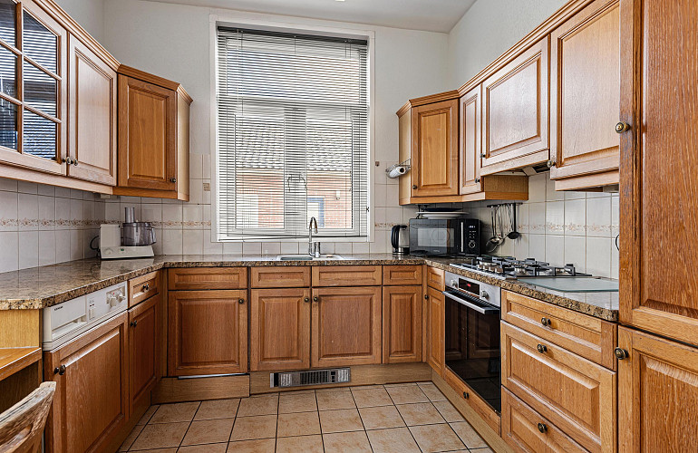 De gesloten keuken (ca. 9 m2) in U-opstelling is gelegen aan de achterzijde van de woning.