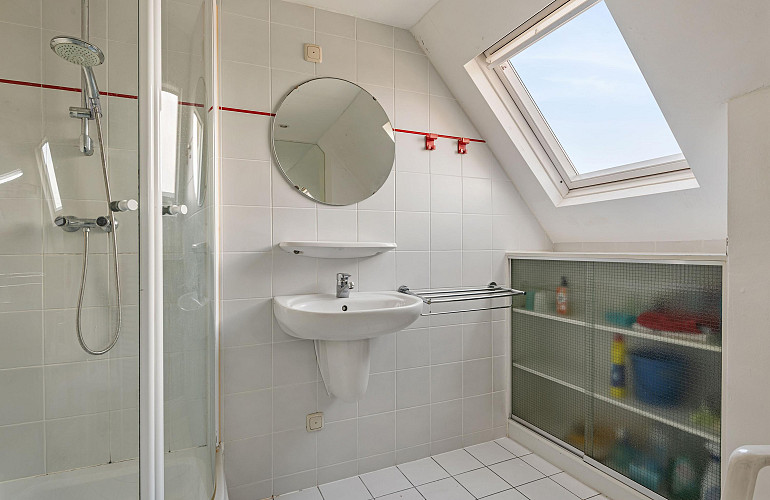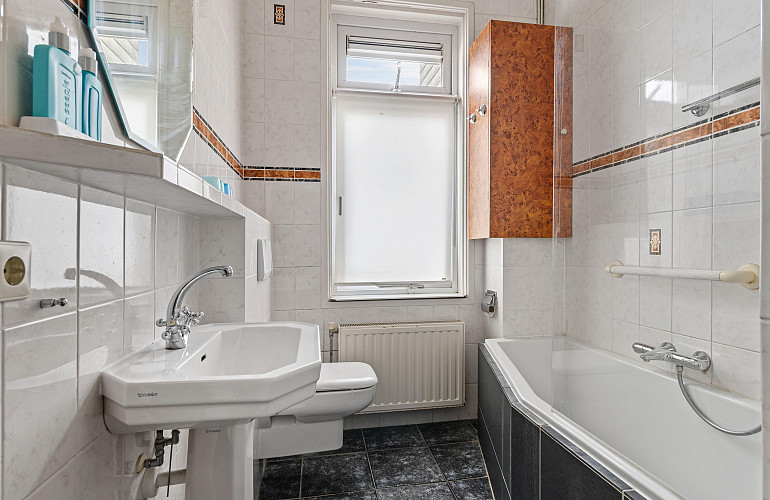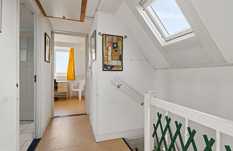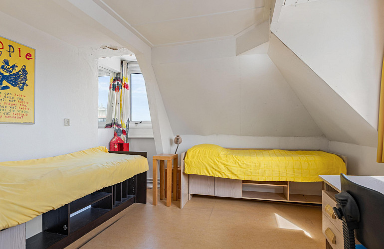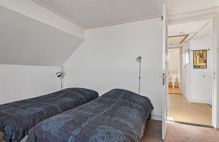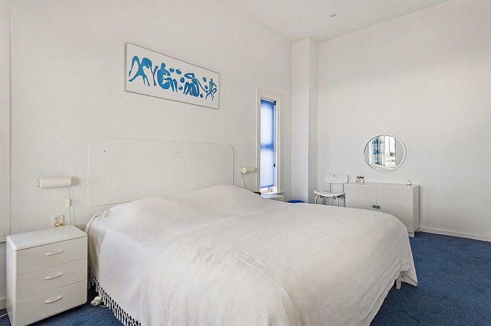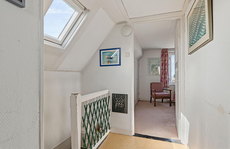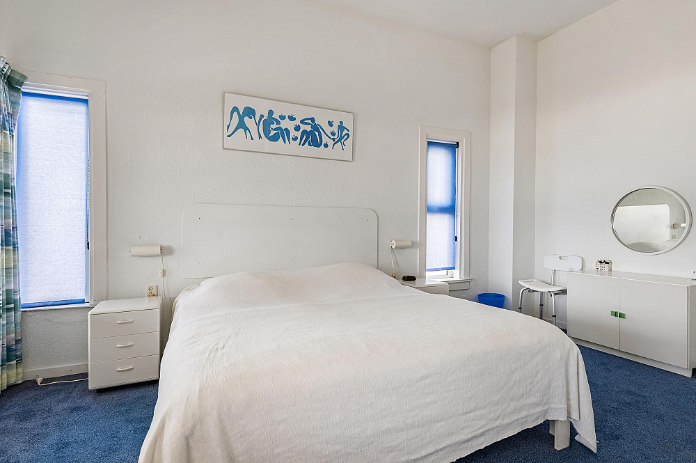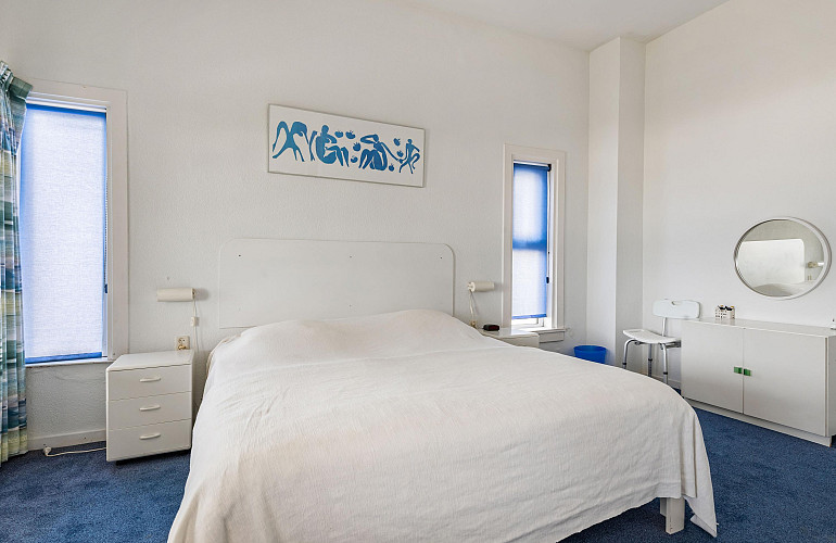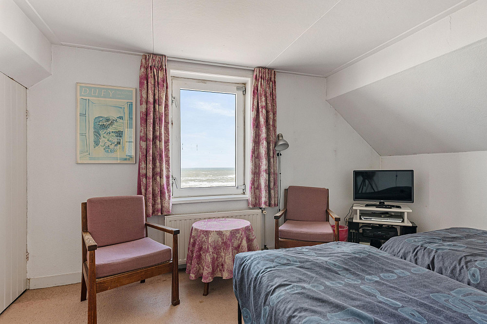 Overloop, twee ruime slaapkamers. De L-vormige slaapkamer aan de voorzijde heeft inbouwkasten en een ruim balkon (ca. 11 m2) met vrij en panoramisch uitzicht over de zee en de boulevard. De slaapkamer aan de achterzijde beschikt eveneens over een ruim en zonnig balkon (ca. 13 m2). De badkamer (en suite) op deze verdieping is voorzien van een ligbad, toilet en wastafel. Balkon achterzijde kan eventueel worden bebouwd met een extra slaapkamer.