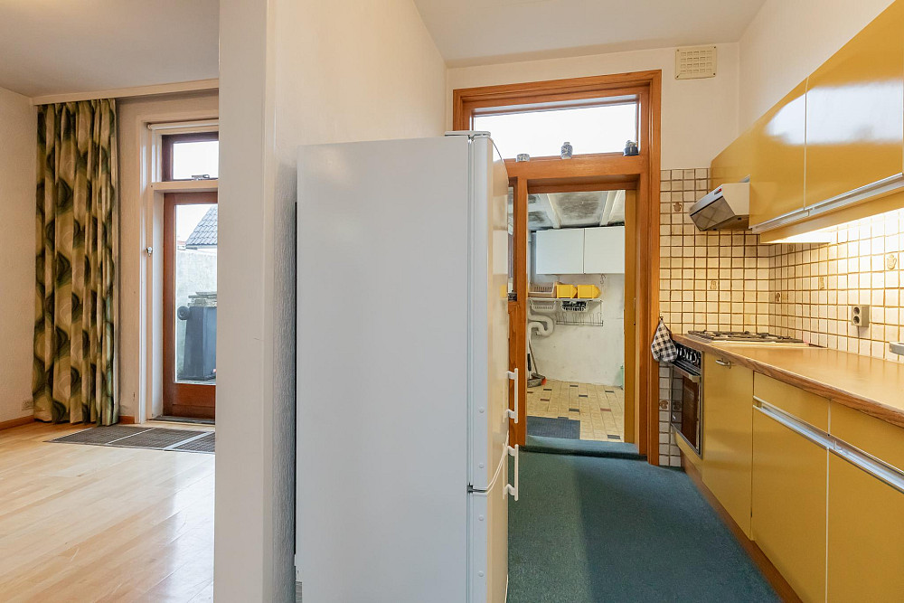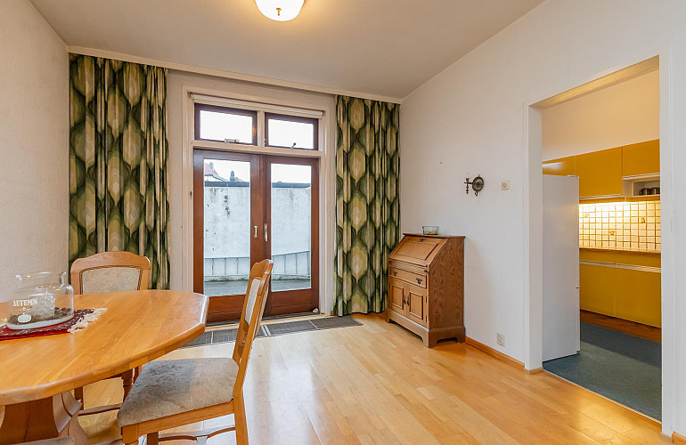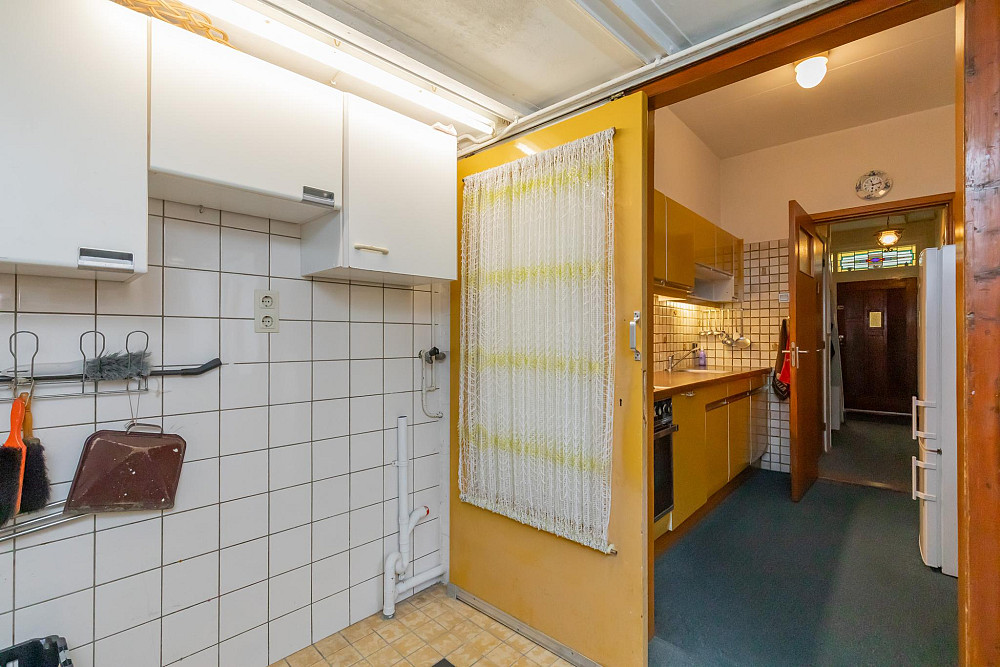 Entree met gang, meterkast en een apart toilet. Royale doorzon woon-/eetkamer met dubbele deuren die leiden naar de achtertuin. Gesloten keuken. Vanuit de keuken is er toegang tot de bijkeuken/berging met wasmachine-aansluiting, die ook van buitenaf bereikbaar is.