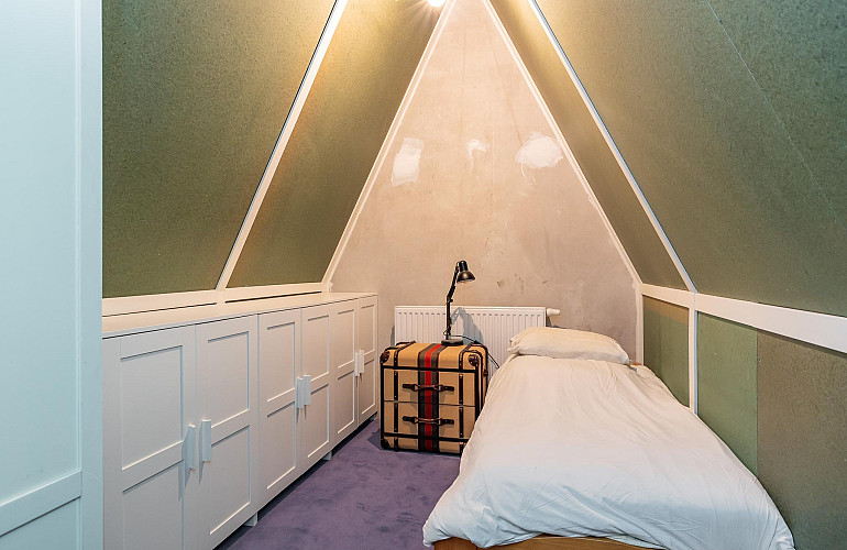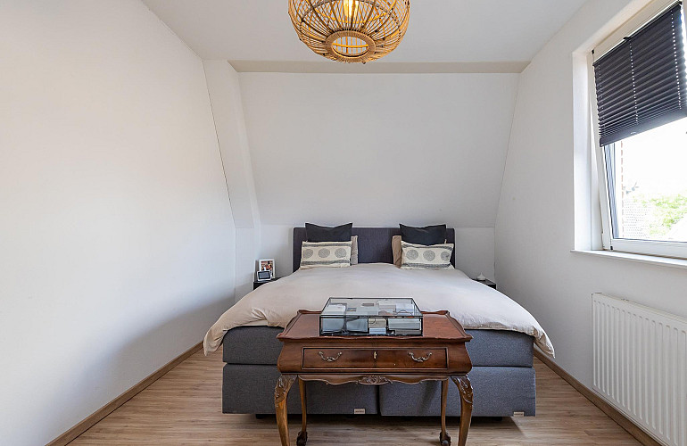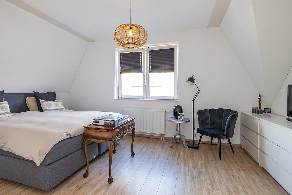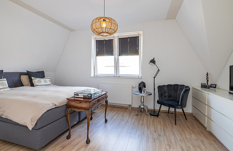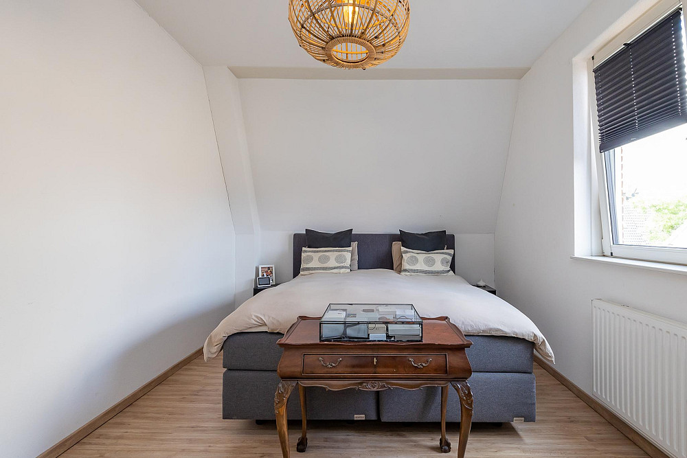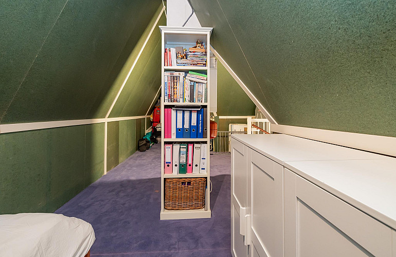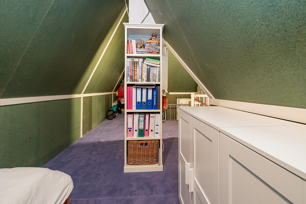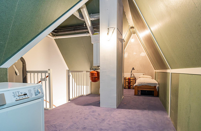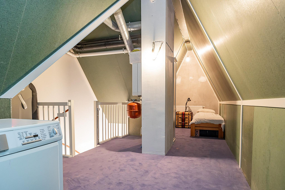 3e Verdieping: Middels een vaste trap bereikt u de ruime zolderkamer met veel bergruimte achter de knieschotten. Mogelijkheid voor een extra slaapkamer middels plaatsing dakra(a)m(en). U treft op deze verdieping ook de opstelling voor c.v.-combiketel, balans ventilatiesysteem met warmteterugwinning en de aansluitingen voor de wasmachine en droger.