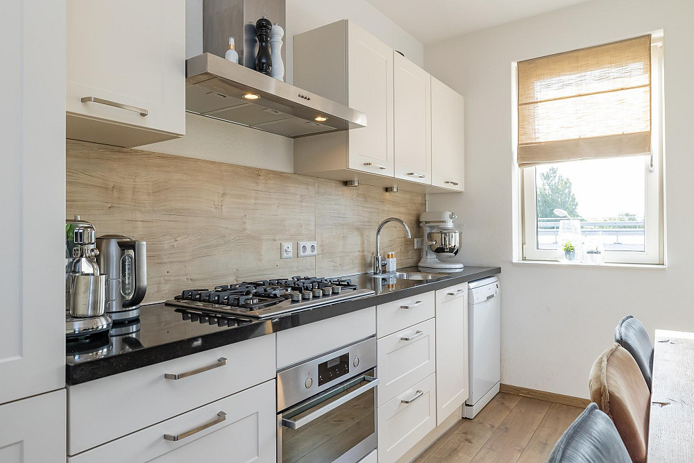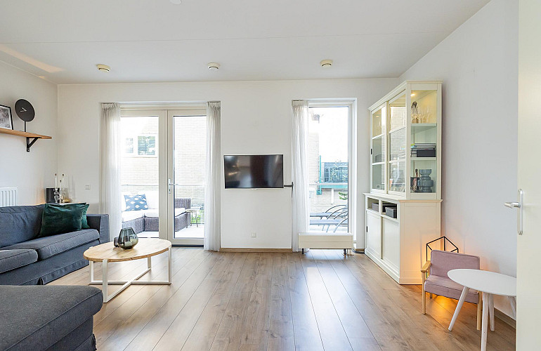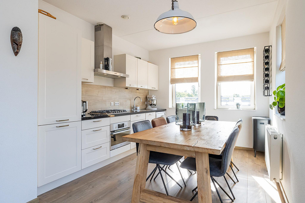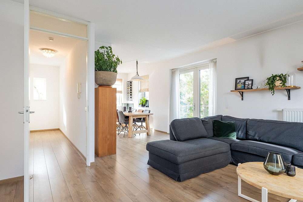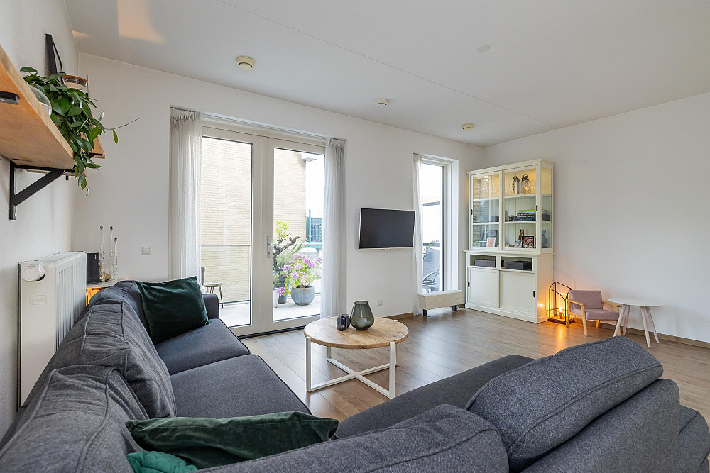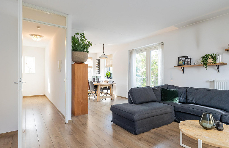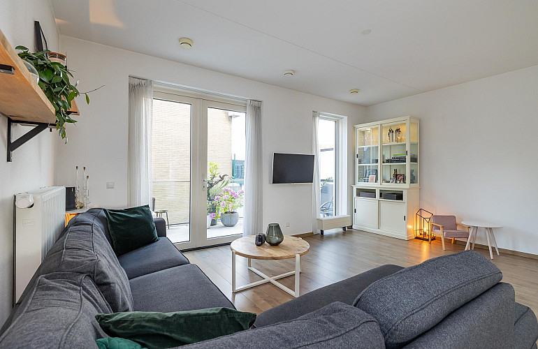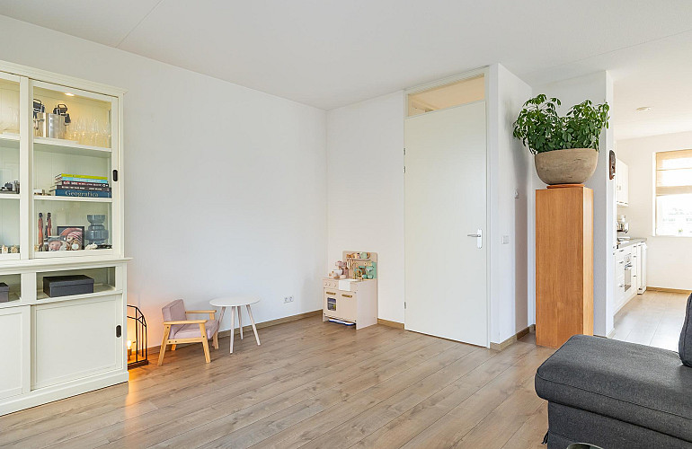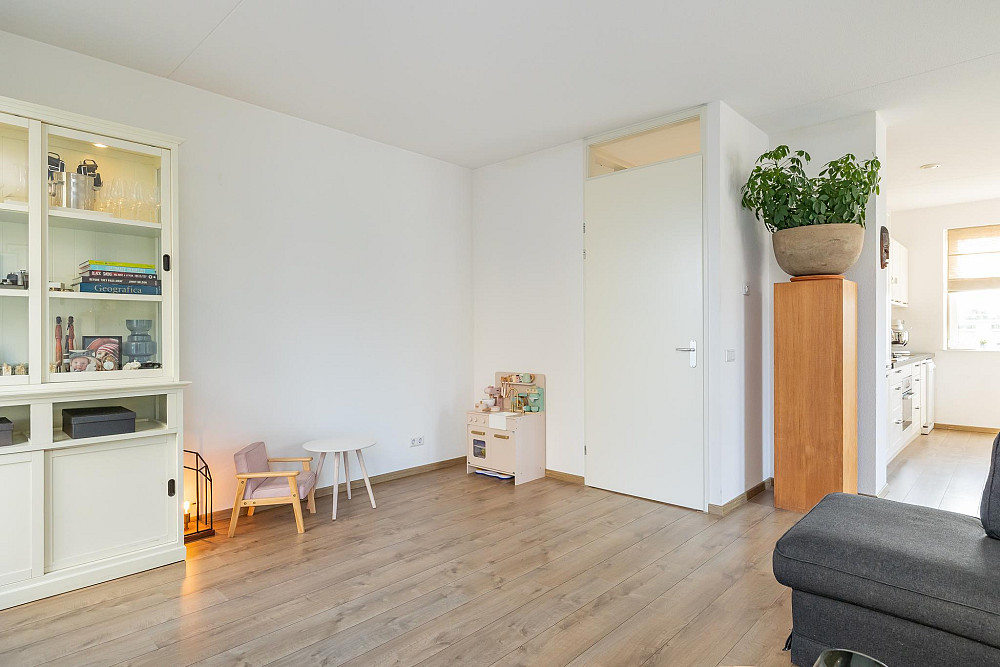 1e Verdieping: Hal met intercom, de garderobe en het toilet voorzien van een fonteintje. Via de ruime hal heeft u toegang tot de zeer lichte L-vormige woonkamer met een oppervlakte van ca. 37 m2, met moderne open keuken en ruim zitgedeelte. De gezellige woonkamer heeft openslaande deuren naar de twee ruime balkons: één zeer zonnig gelegen aan de zuidzijde (praktisch de hele dag de zon!) en een mooi groot balkon van ca. 12 m2 met middag-/avondzon (noordwesten gelegen) aan de achterzijde. Ideaal om te ontspannen en van de middag- en avondzon te genieten! De keuken is geplaatst in een rechte opstelling en is voorzien van diverse inbouwapparatuur te weten: 5 pits gaskookplaat, RVS afzuigkap en combi oven/magnetron. De keuken is uitgevoerd in het wit met een granieten aanrechtblad en geeft de ruimte een moderne uitstraling. Deze gehele verdieping is afgewerkt met een lichte laminaatvloer en de wanden en plafonds zijn voorzien van licht spuitwerk.