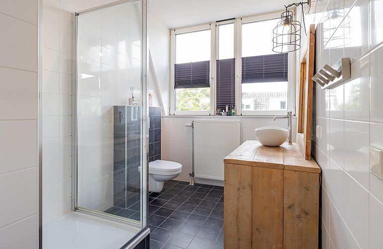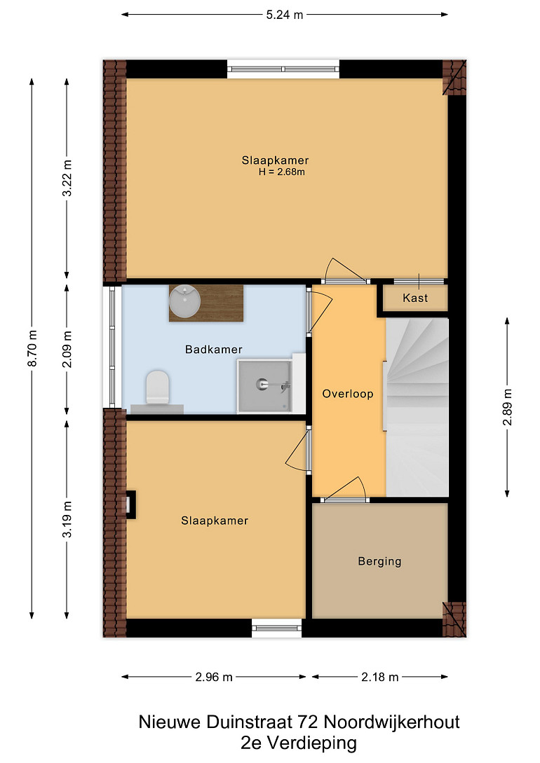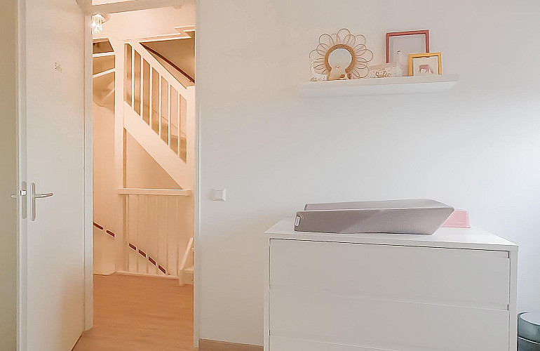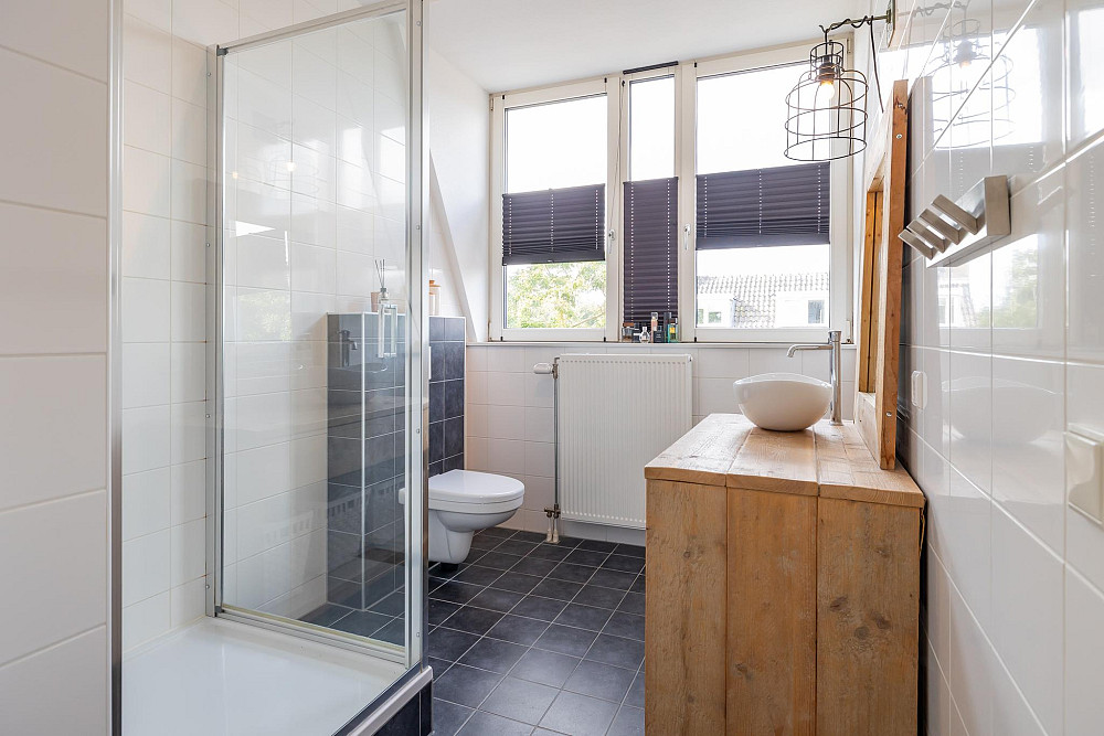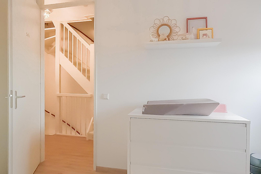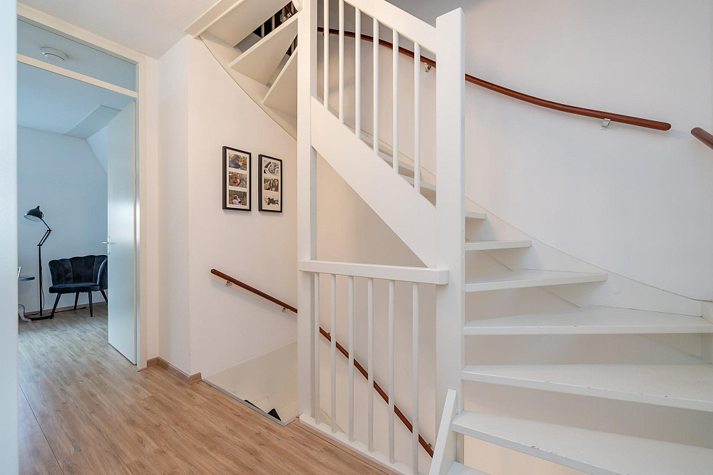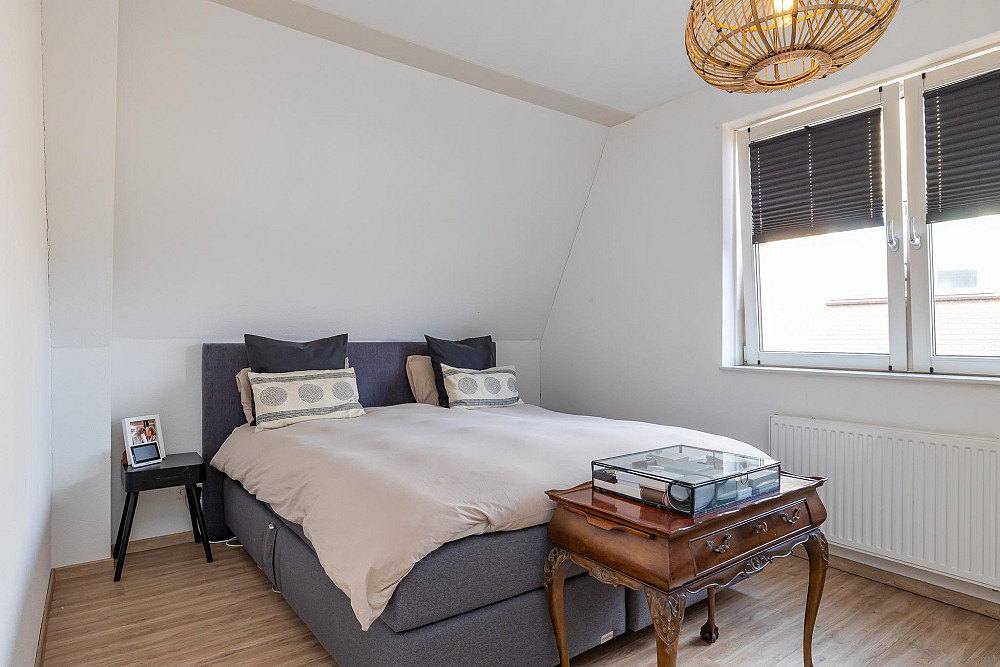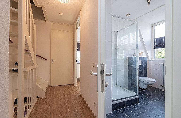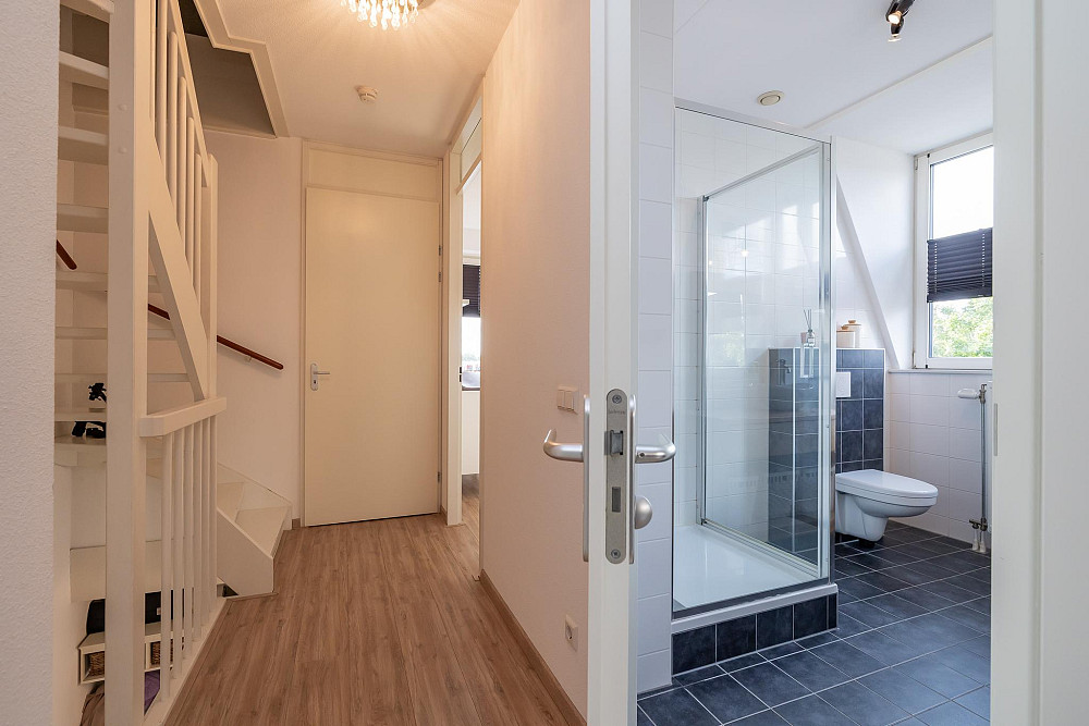 2e Verdieping: Vanaf de overloop heeft u toegang tot beide slaapkamers, de badkamer en een ruime inpandige berging. Aan de achterzijde bevindt zich de riante hoofdslaapkamer met vaste kast. Aan de voorzijde van de woning bevindt zich de tweede slaapkamer. De moderne badkamer is voorzien van een dakkapel, volledig betegeld en voorzien van een wastafelmeubel, wandcloset, ruime douchecabine en radiator. Ook deze verdieping is afgewerkt met een lichte laminaatvloer en spuitwerk op de wanden en plafonds.