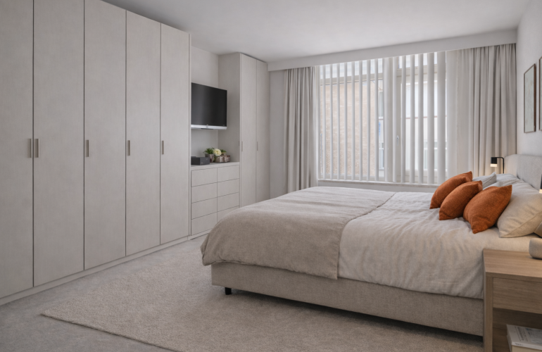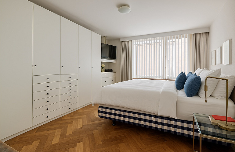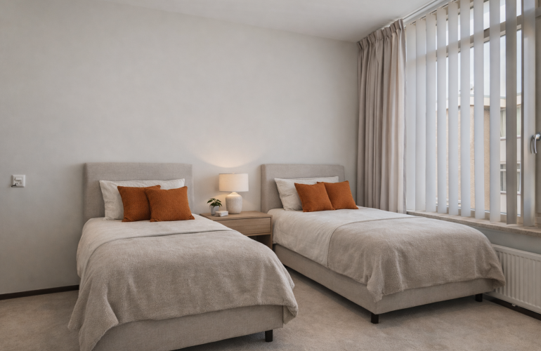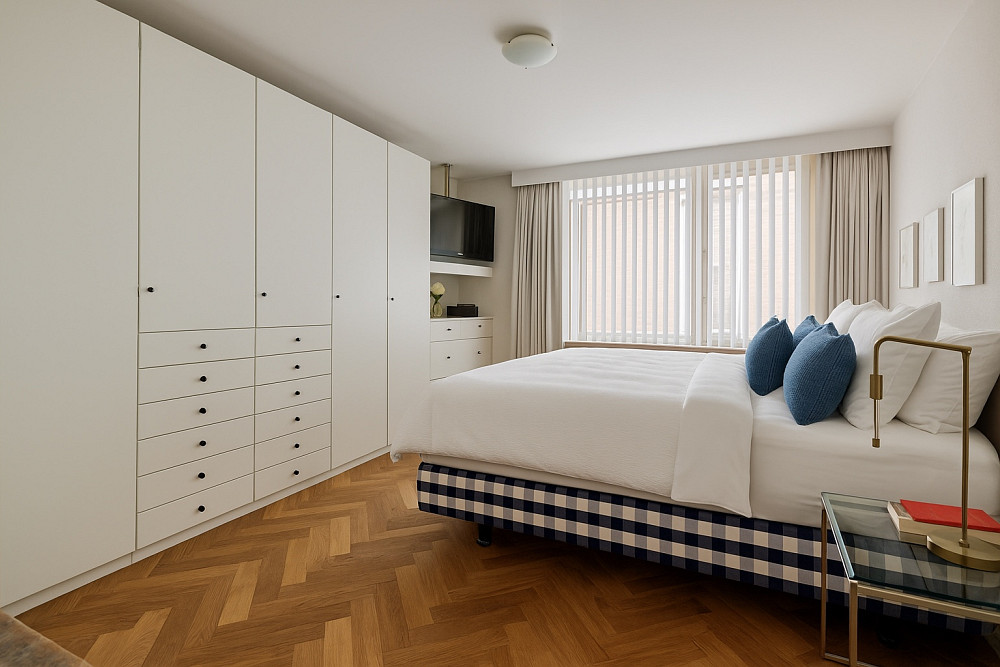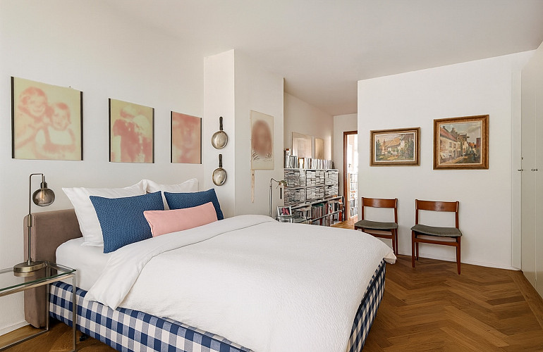 Het penthouse beschikt over drie volwaardige slaapkamers en in totaal drie badkamers. De master bedroom is voorzien van een eigen badkamer, de tweede badkamer en een separaat toilet zorgen voor extra comfort voor bewoners en gasten. De derde badkamer wordt momenteel gebruikt als bergruimte, maar kan eenvoudig weer in gebruik worden genomen als volwaardige badkamer.
