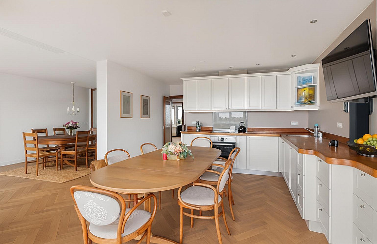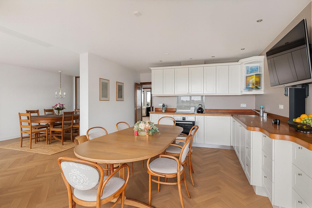 De lichte woonkamer met grote raampartijen en een sfeervolle gashaard, biedt een vrij uitzicht over Noordwijk. Vanuit een hoek van de kamer (momenteel ingericht als studeerhoek) geniet u zelfs van een fraai zeezicht. Aansluitend bevindt zich de eetkamer en de woon/eetkeuken in L-opstelling, uitgevoerd met uitgebreide inbouwapparatuur: vriezer, koelkast, vaatwasser, oven, inductiekookplaat, close-in boiler en afzuigkap. Een smaakvolle combinatie van vakmanschap en comfort.