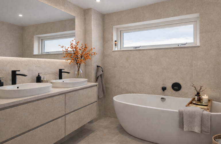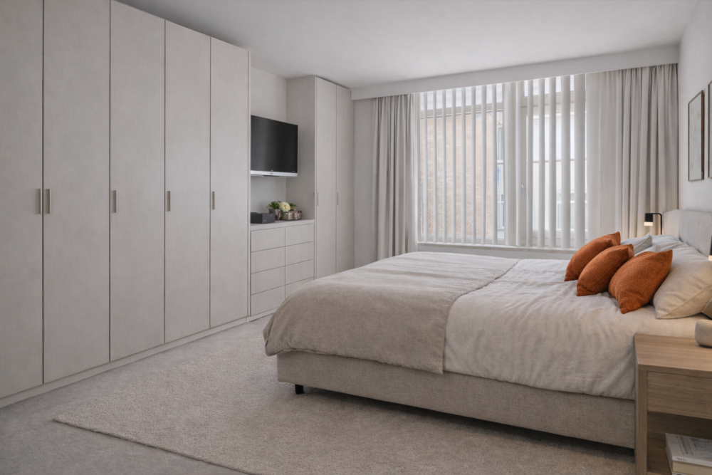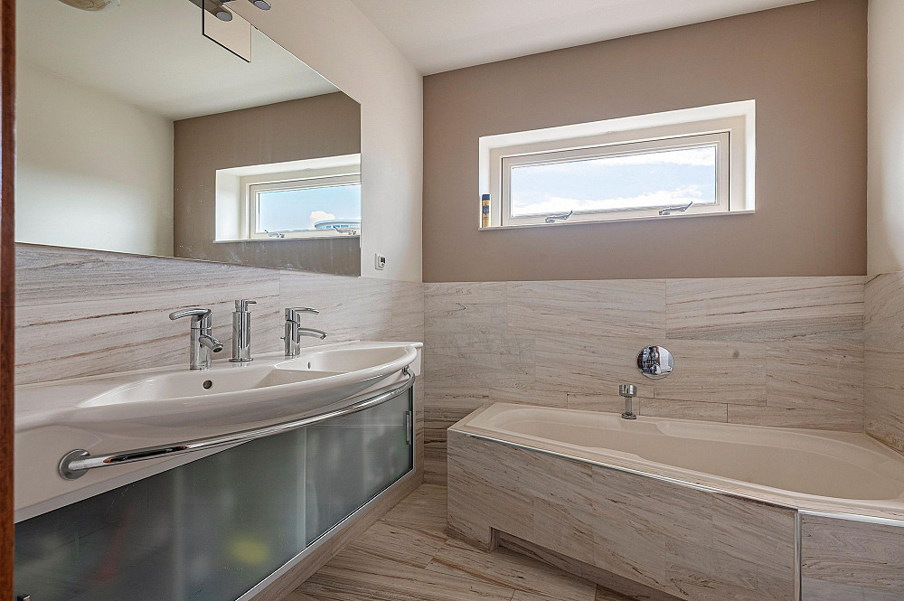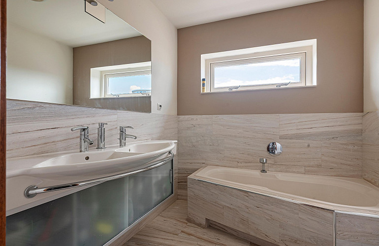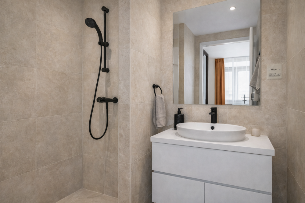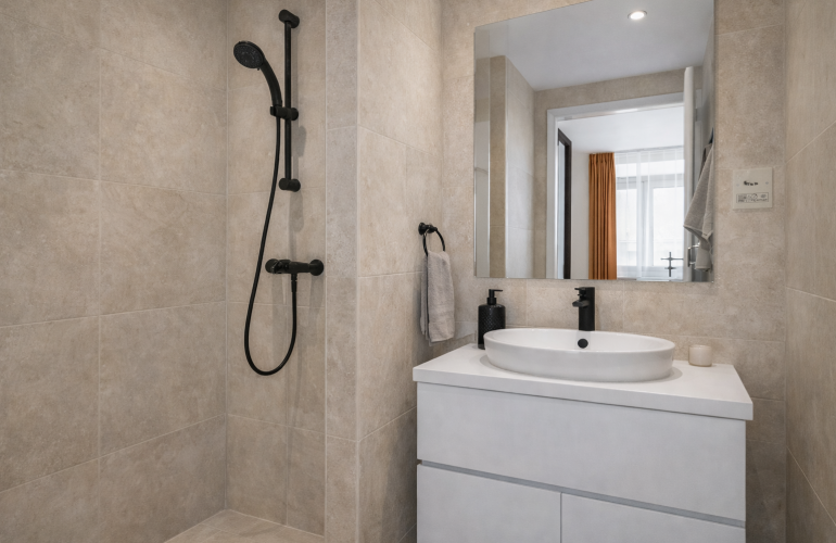 Het penthouse beschikt over drie volwaardige slaapkamers en in totaal drie badkamers. De master bedroom is voorzien van een eigen badkamer, de tweede badkamer en een separaat toilet zorgen voor extra comfort voor bewoners en gasten. De derde badkamer wordt momenteel gebruikt als bergruimte, maar kan eenvoudig weer in gebruik worden genomen als volwaardige badkamer.