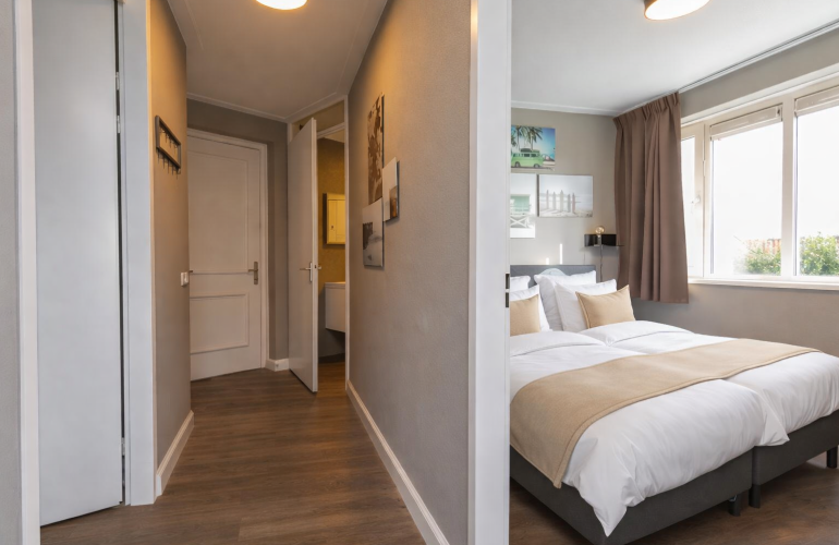De indeling van het appartement is als volgt: Een ruime entreehal, een moderne badkamer met wastafelmeubel, toilet en douche. De badkamer wordt in maart voorzien van nieuwe douchedeuren, toilet en wasmachine kast met opbergruimte. Wanneer u doorloopt naar de hal treft u aan weerszijden een tweepersoonsslaapkamer aan: een master bedroom en een kleinere slaapkamer. De entreehal mondt uit in een grote living met open-keuken. De woonkamer is onderverdeeld in een lounche-gedeelte en een deel waar de grote eettafel staat. De keuken is verrijkt qua keukenapparaten zoals een inductiekookplaat, combimagnetron, vaatwasser, oven, inbouwkast met vriezer een wandafzuigkap. Aan de woonkamer grenst een heerlijk en ruim balkon op het Zuiden. Het balkon is nog voorzien van een luxe, elektrisch bedienbaar en verlicht zonnescherm. De woonvertrekken zijn voorzien van een comfortabele PVC-vloer met vloerverwarming. Het appartement wordt voorts geheel compleet opgeleverd inclusief de volledige inrichting.