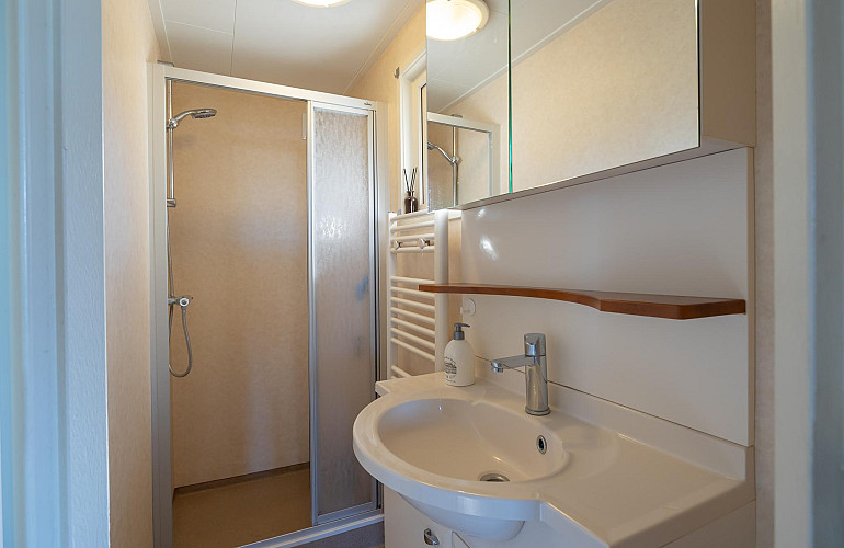 Indeling: Entree, hal, toilet, badkamer met douche, designradiator en wastafel, hoofdslaapkamer met boxspring, vaste kast, airconditioning en C.V. gasafdeling, 2e slaapkamer uitgevoerd met 2 geschakelde vaste bedden (hoog en laag), open keuken voorzien van diverse inbouw apparatuur (koelkast, vriezer, gaskookplaat afzuigschouw, combimagnetron en vaatwasser), woon/eetkamer (ca. 22 m2) met laminaatvloer, airconditioning en schuifpui naar het terras.