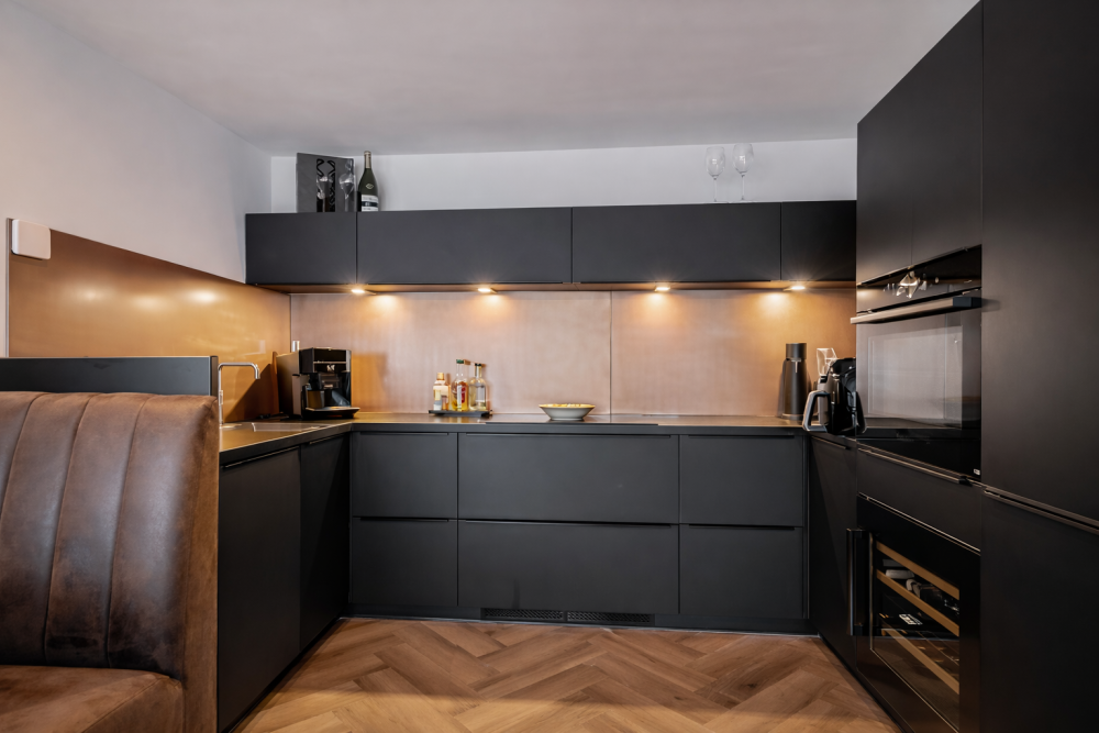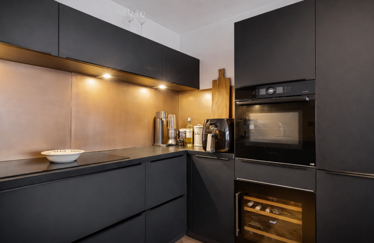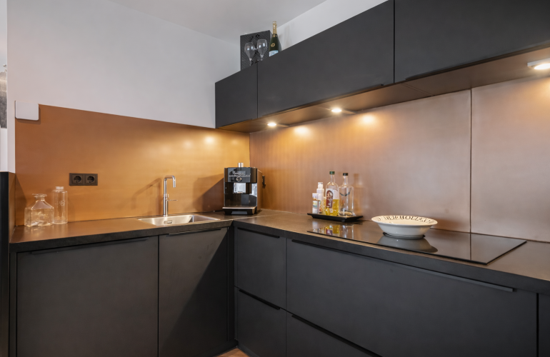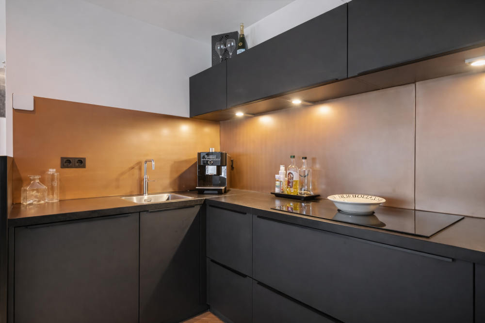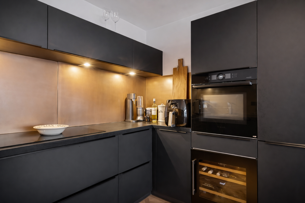 - Luxe keuken met hoogwaardige inbouwapparatuur en composiet werkblad;