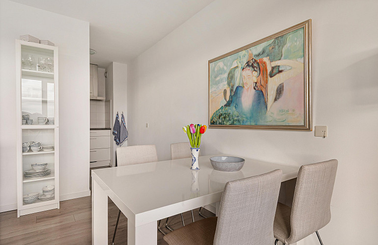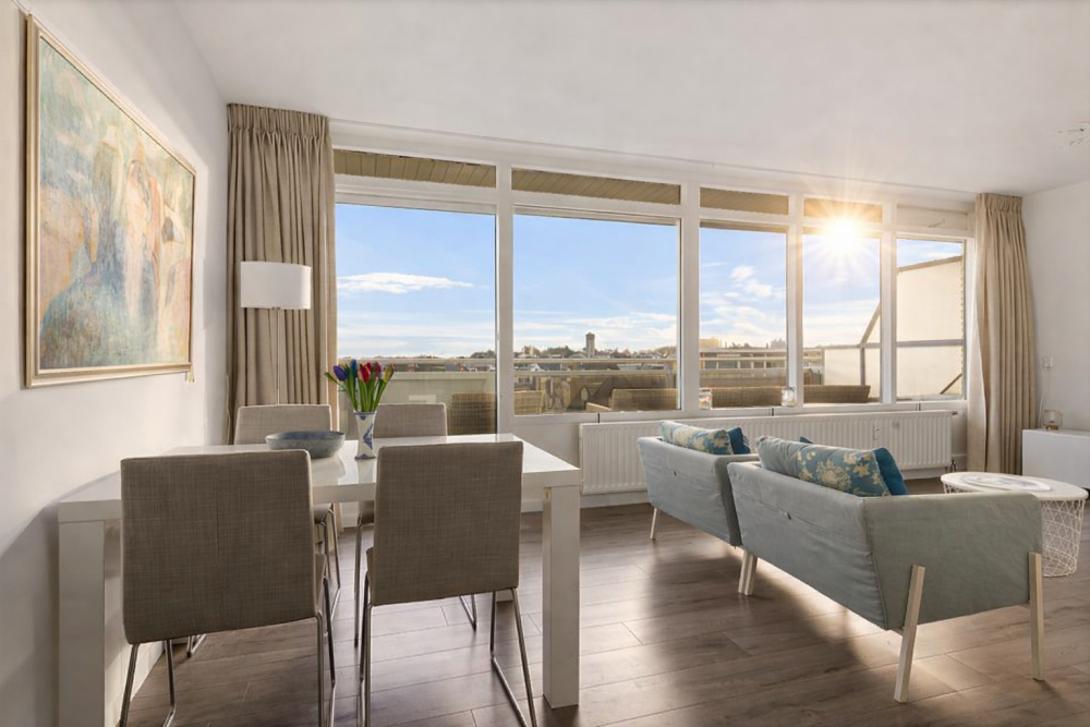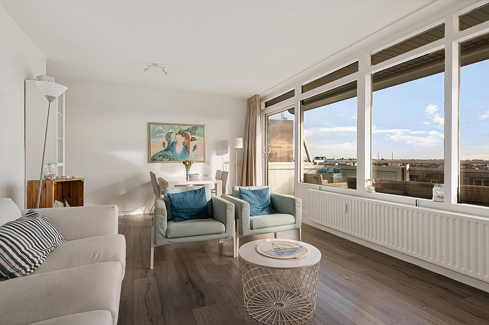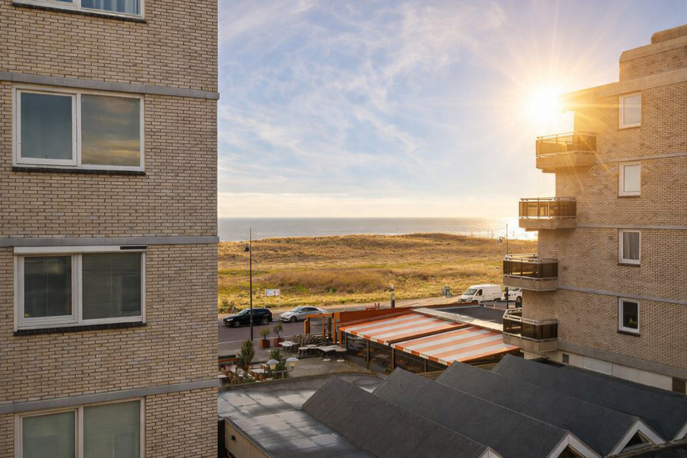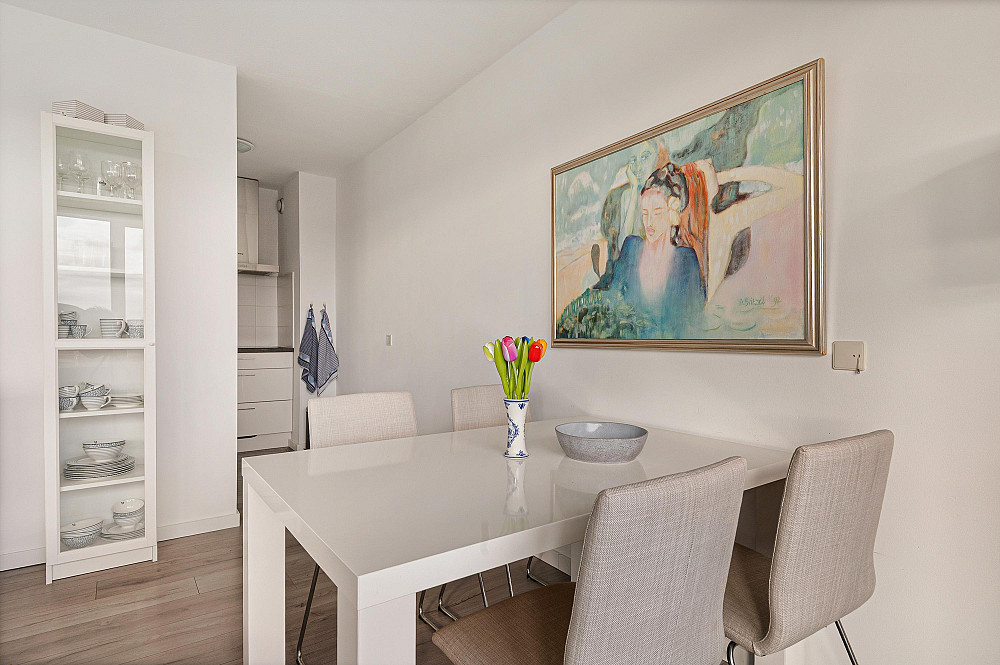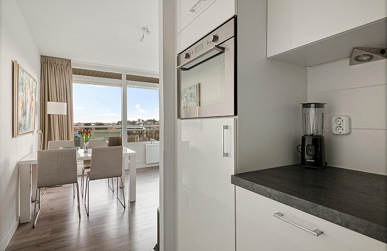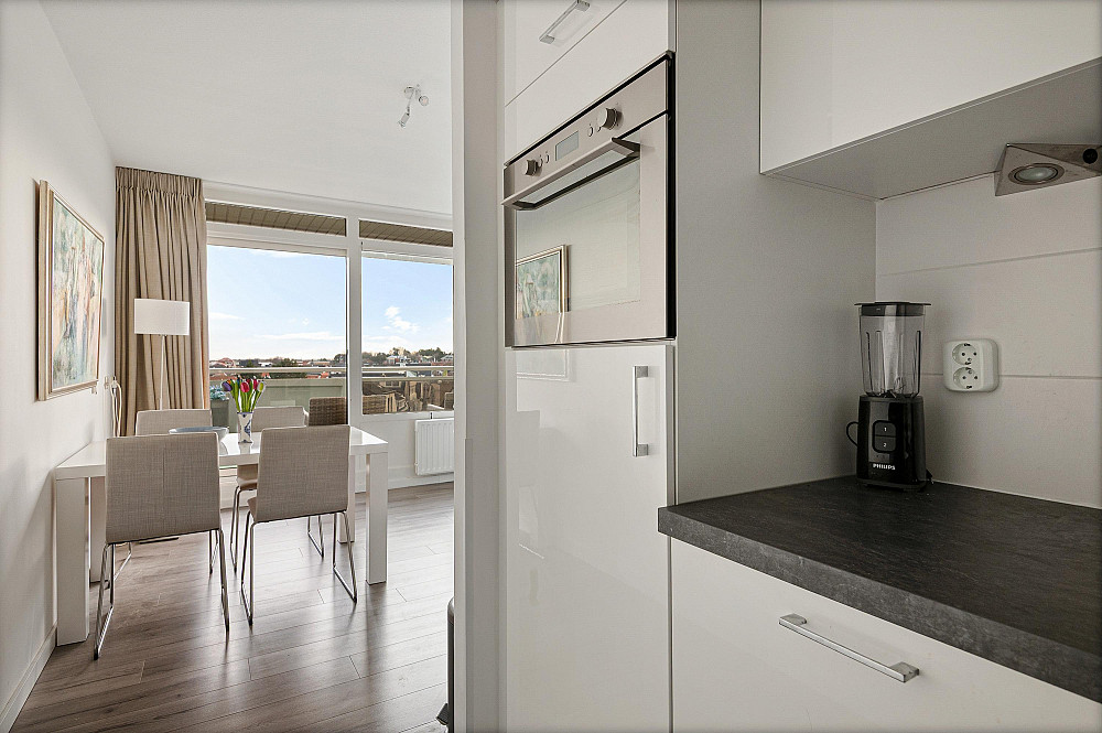 De lichte woon/eetkamer beschikt over een brede glaspartij met schuifpui naar het ruime terras van ca. 14 m², waardoor binnen en buiten prettig met elkaar zijn verbonden. Vanuit de woonkamer en het terras kijkt u vrij uit over Noordwijk aan Zee, wat het gevoel van ruimte en rust versterkt. De open keuken is circa 6 jaar oud, uitgevoerd in een lichte kleurstelling en voorzien van een vaatwasser, inductiekookplaat, combimagnetron/oven en een koelkast met vriesvak.