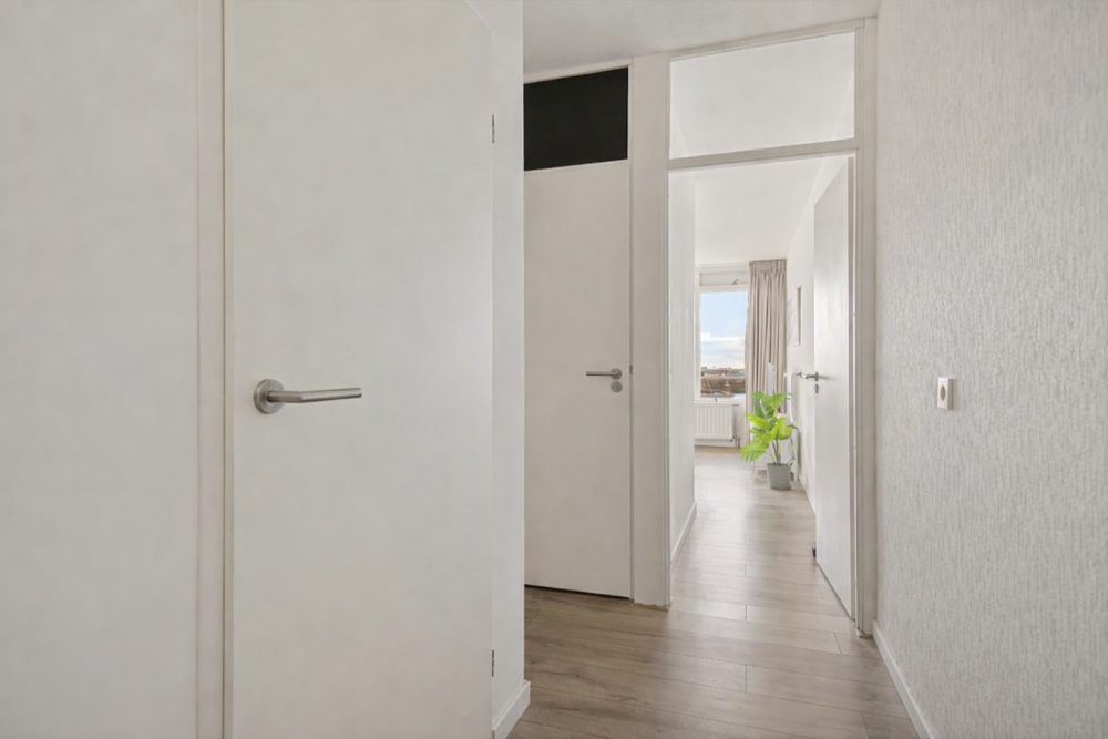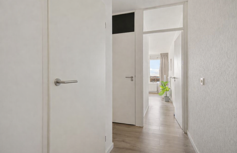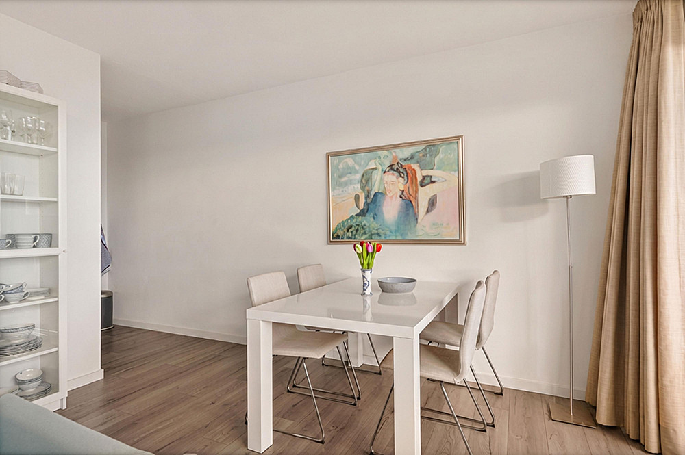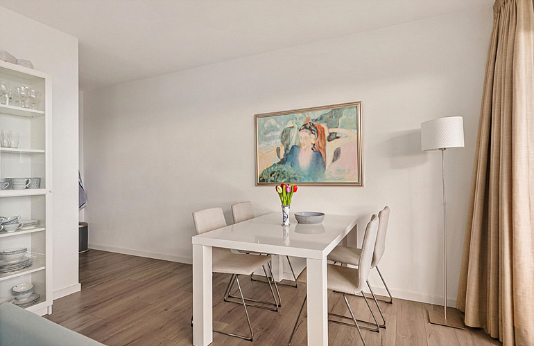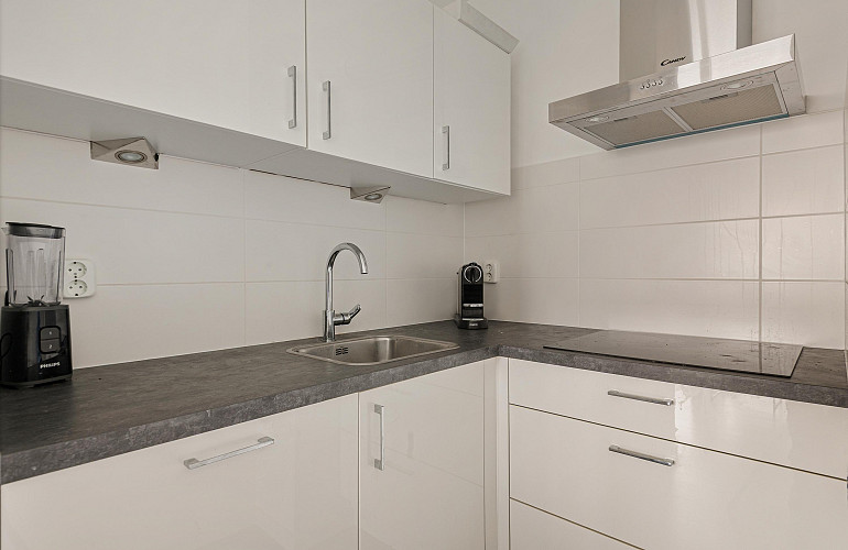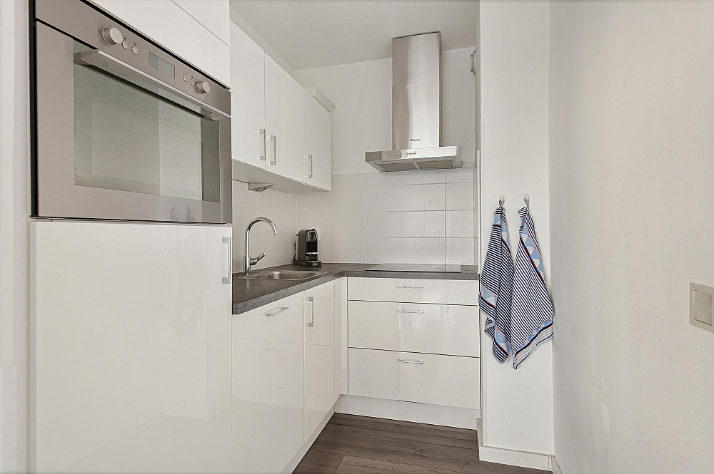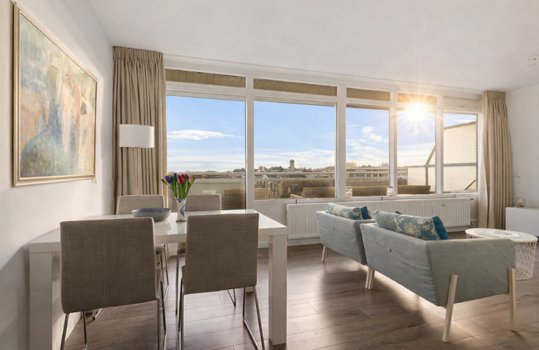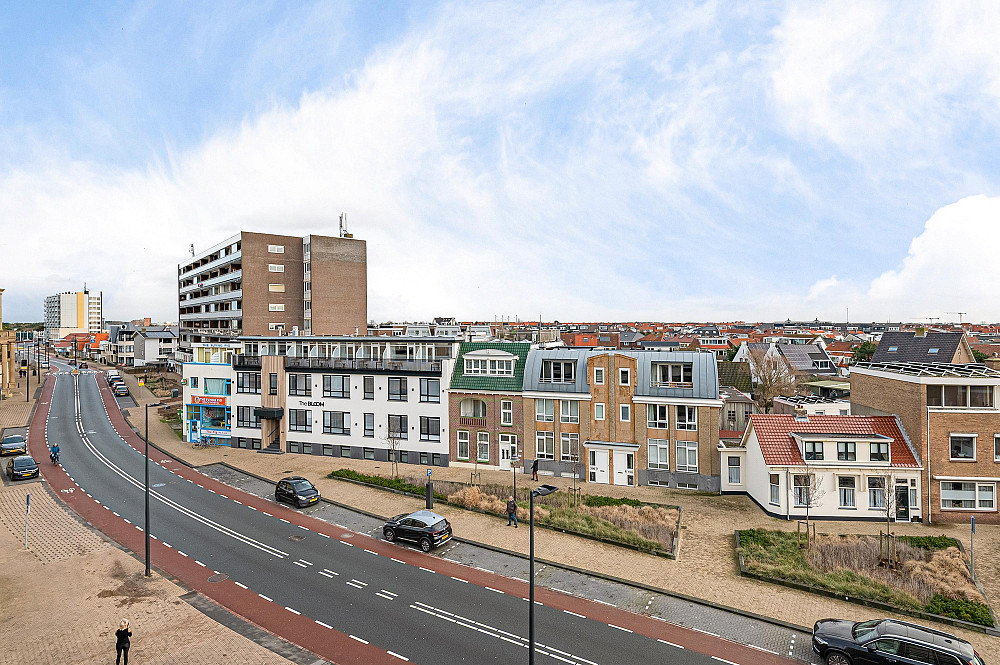 De lichte woon/eetkamer beschikt over een brede glaspartij met schuifpui naar het ruime terras van ca. 14 m², waardoor binnen en buiten prettig met elkaar zijn verbonden. Vanuit de woonkamer en het terras kijkt u vrij uit over Noordwijk aan Zee, wat het gevoel van ruimte en rust versterkt. De open keuken is circa 6 jaar oud, uitgevoerd in een lichte kleurstelling en voorzien van een vaatwasser, inductiekookplaat, combimagnetron/oven en een koelkast met vriesvak.