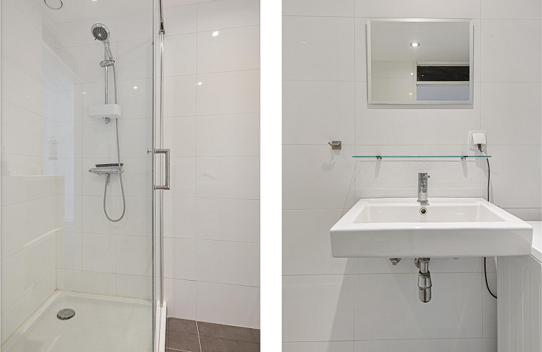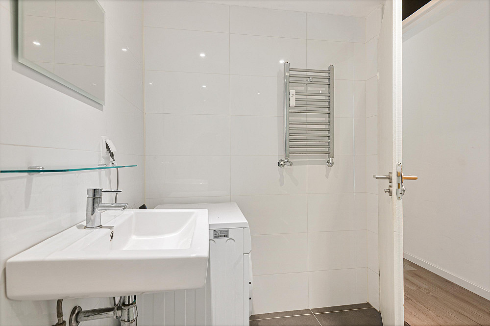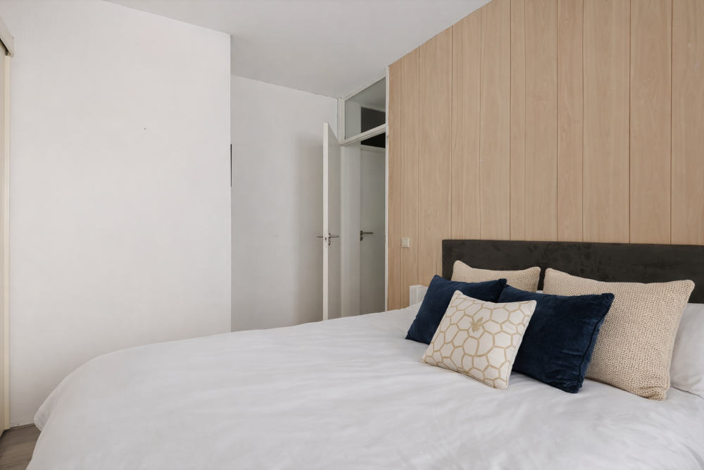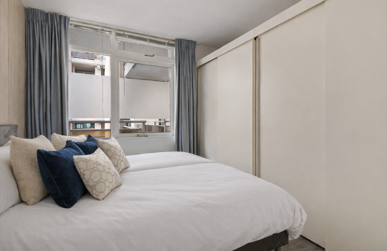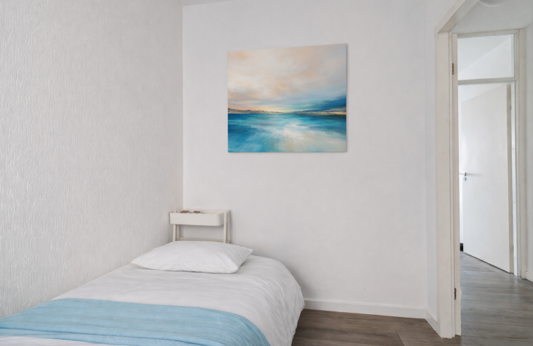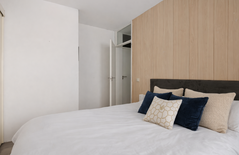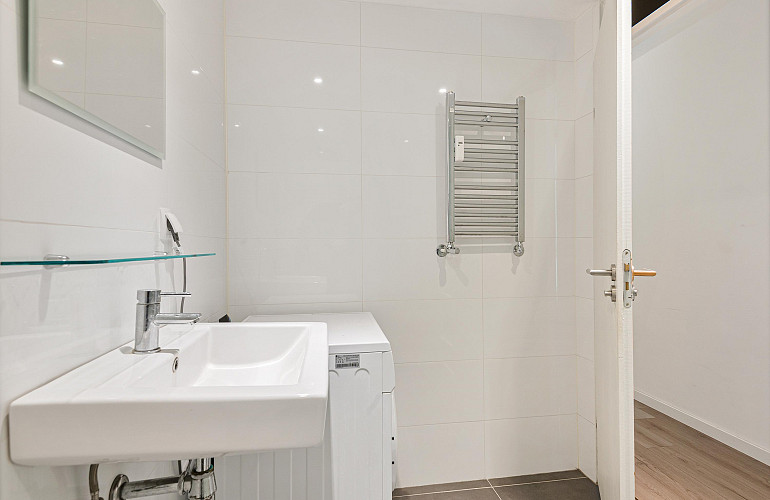 Het appartement beschikt over twee slaapkamers: een comfortabele ouderslaapkamer en een tweede slaap- of werkkamer. Ook vanuit de slaapkamers is er een open zichtlijn richting het dorp en de kust, wat bijdraagt aan het lichte karakter van het appartement. De lichte badkamer is netjes afgewerkt en voorzien van een inloopdouche, wastafel, handdoekradiator en wasmachineaansluiting. Daarnaast is er een separate, volledig betegelde toiletruimte met zwevend toilet en fonteintje.