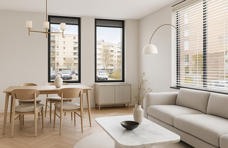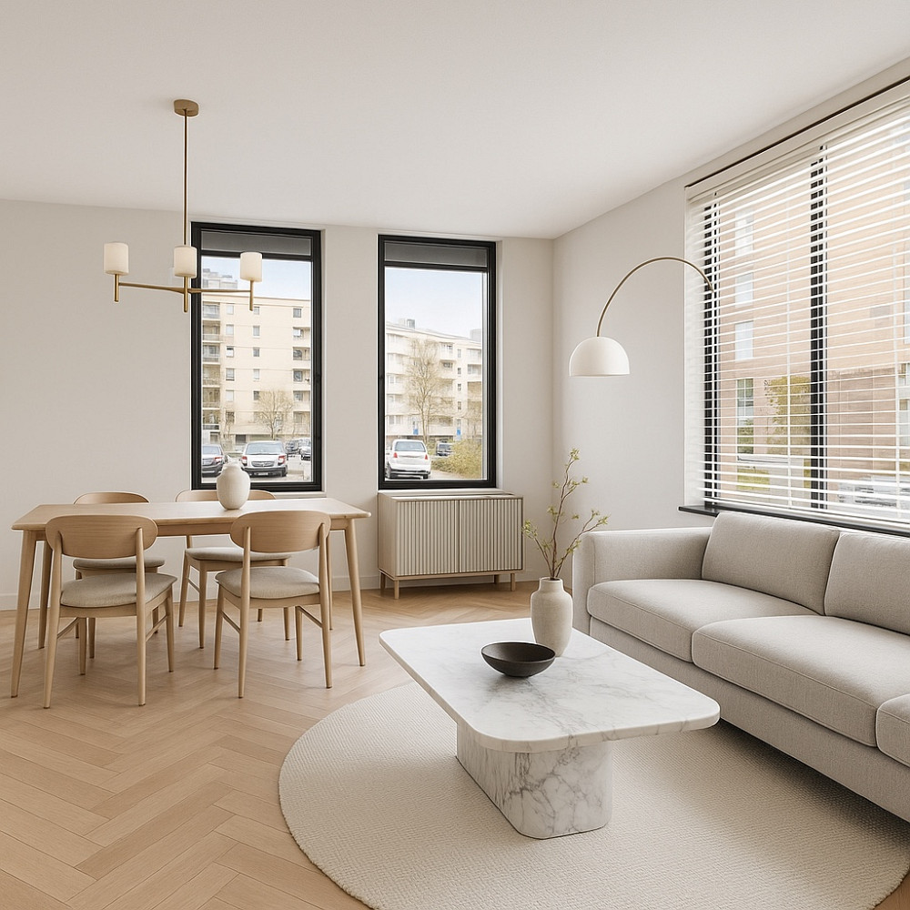 Woon-/eetkamer: Lichte en sfeervolle ruimte aan de voorzijde van de woning.