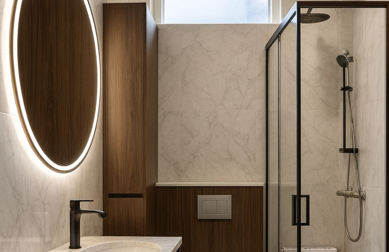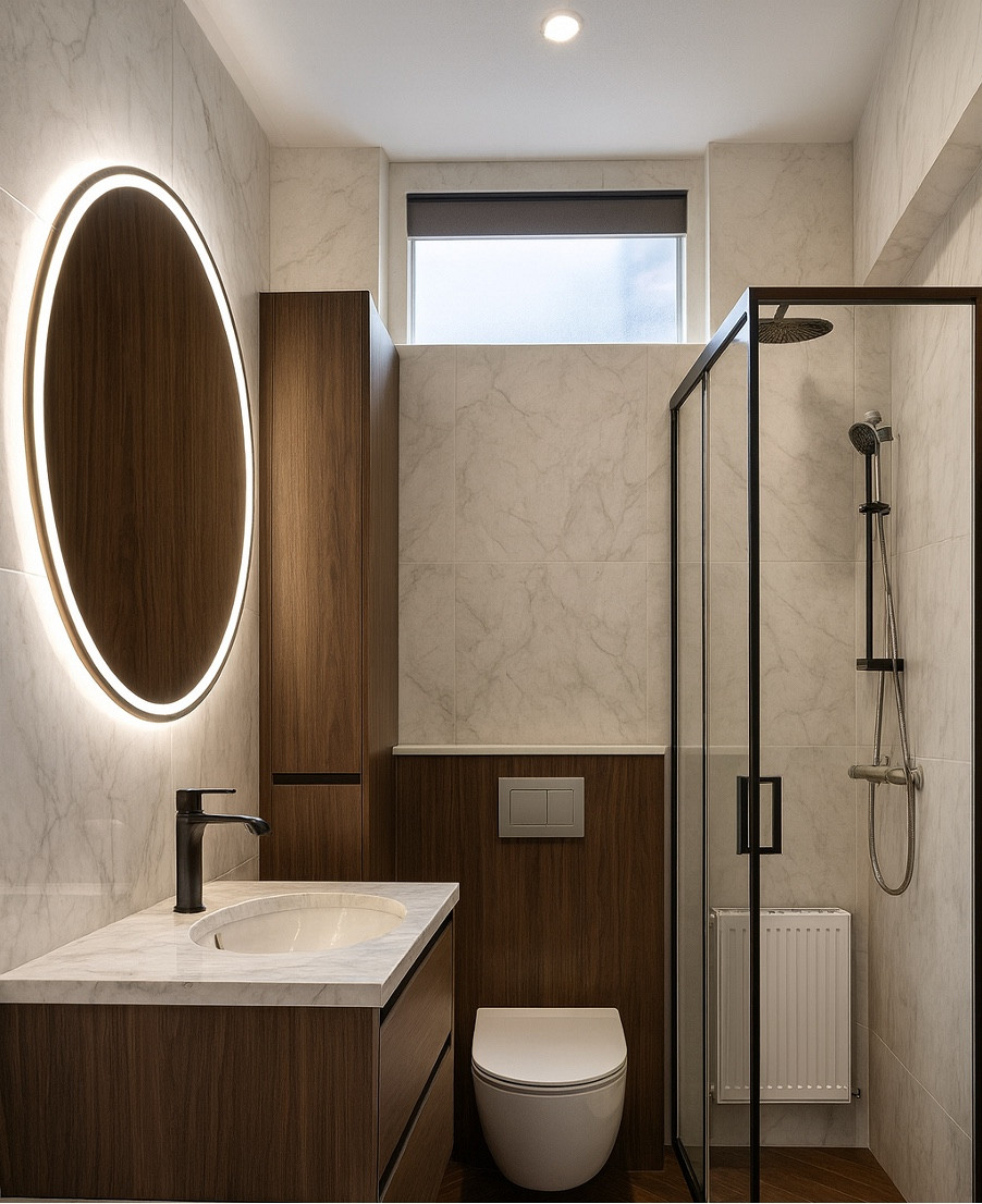 Badkamer: Voorzien van een douchecabine, wastafel, toilet en aansluiting voor wasapparatuur.