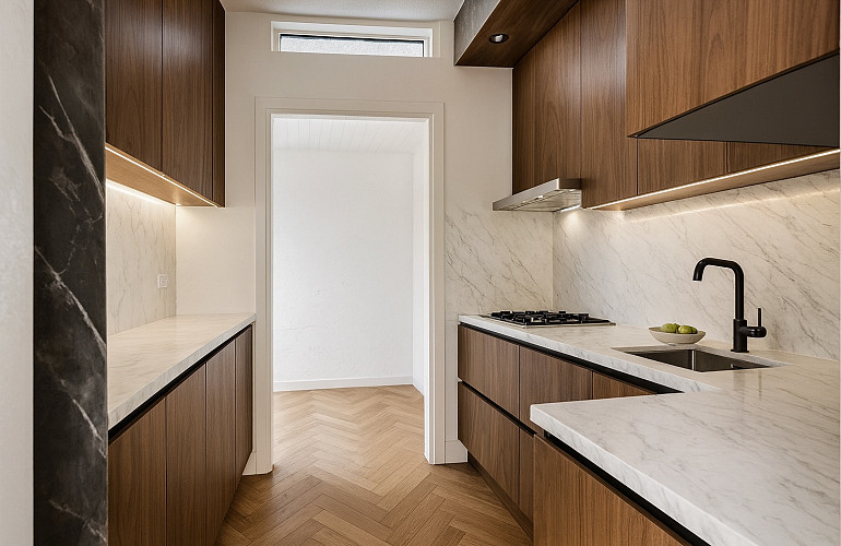 Keuken: Eenvoudige keuken bereikbaar vanuit de woonkamer.