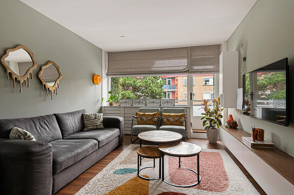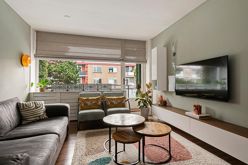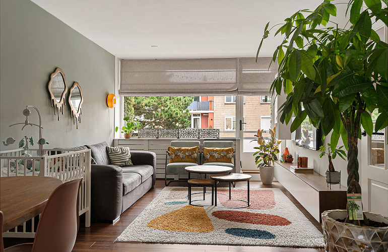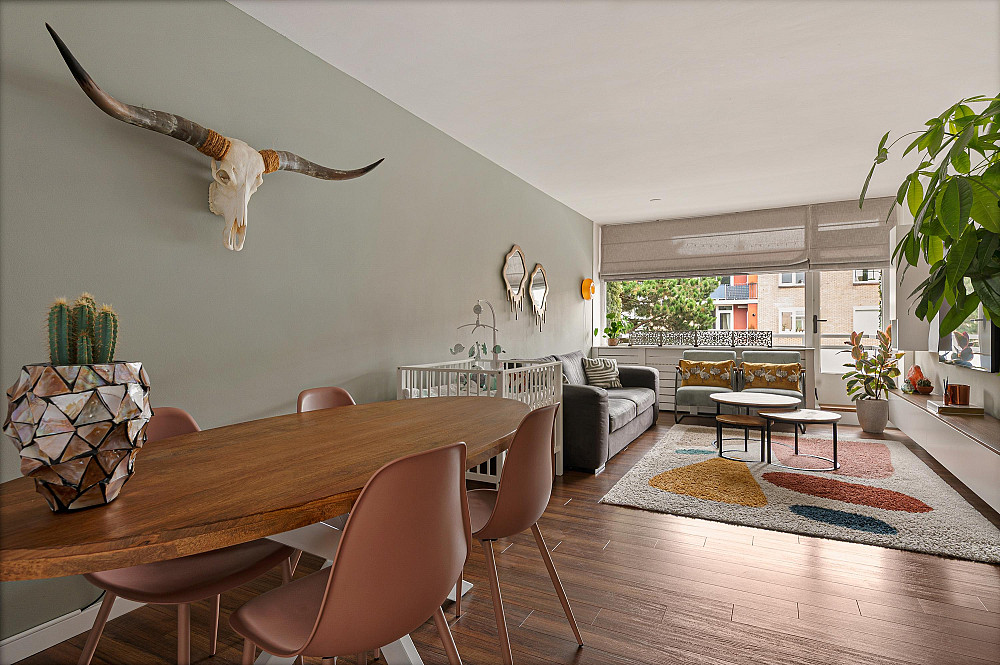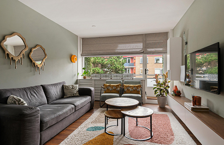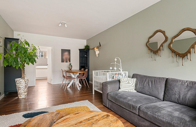 De lichte woonkamer ligt aan het einde van de woning en biedt toegang tot het balkon op het zuidwesten.
