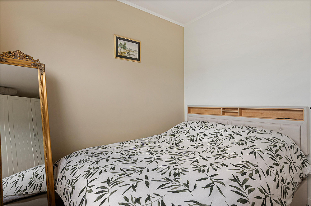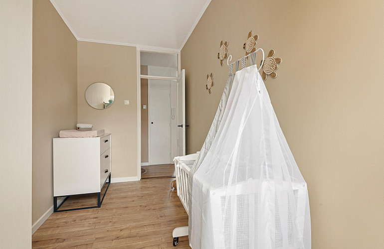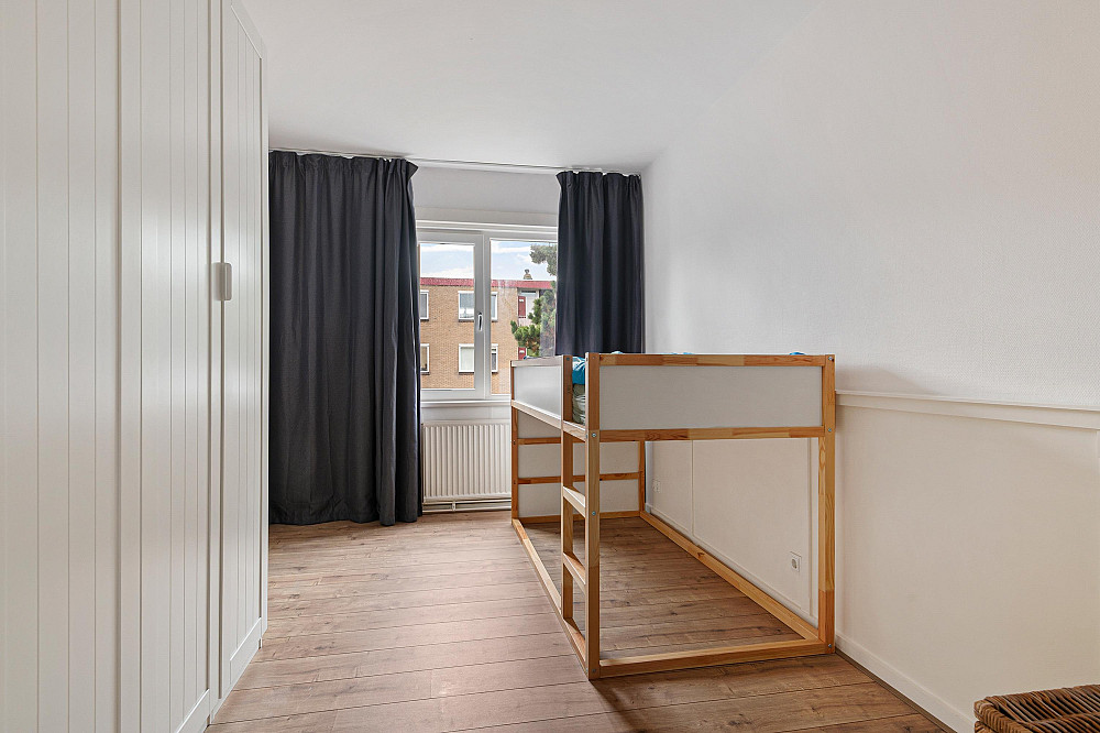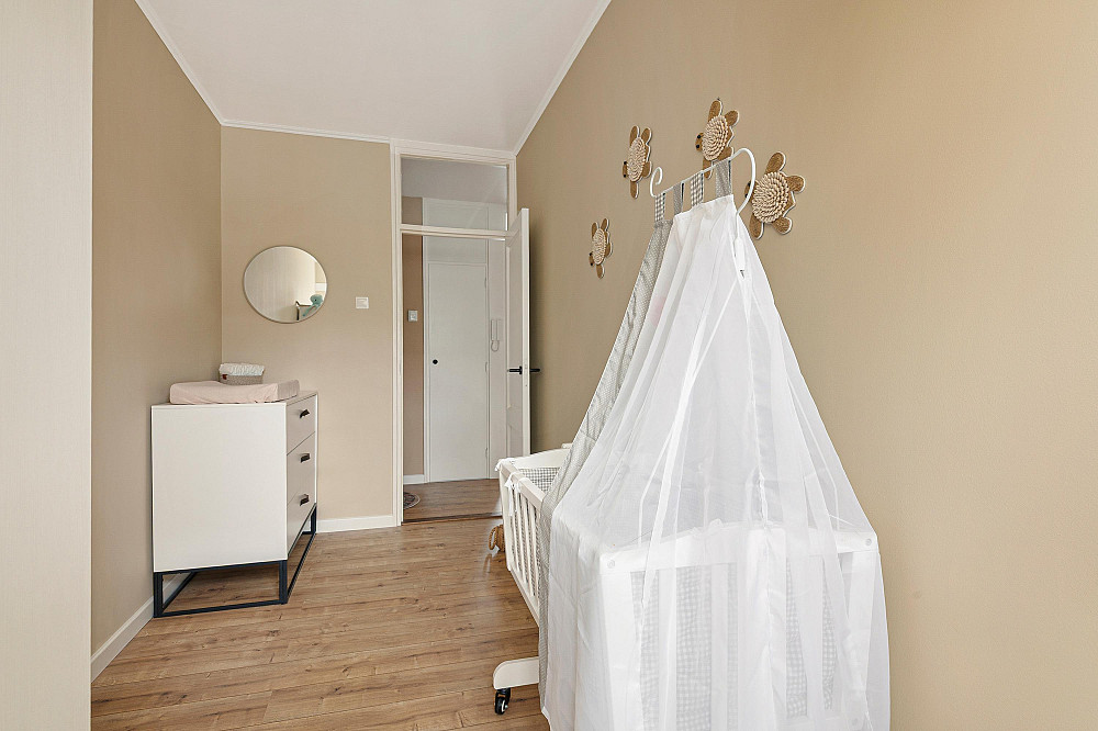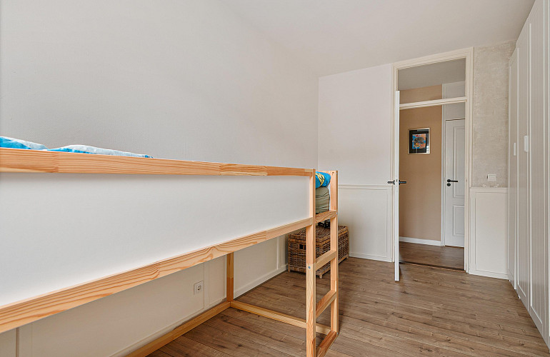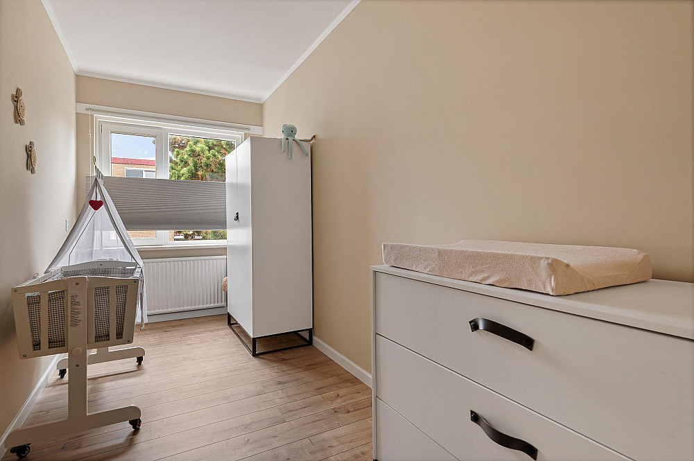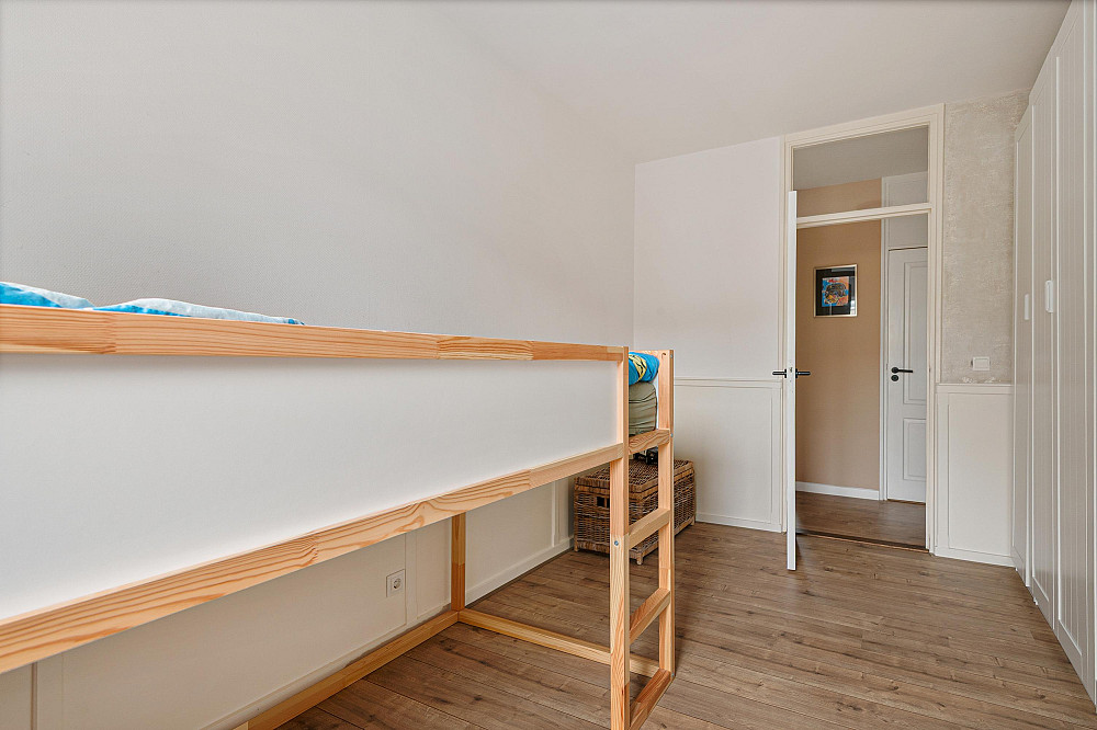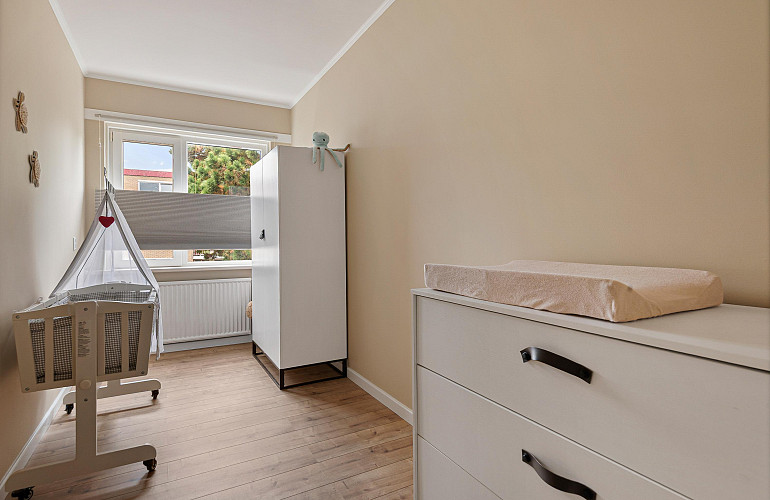 De derde slaapkamer grenst aan de woonkamer; de overige twee slaapkamers bevinden zich aan de andere zijde van het appartement.