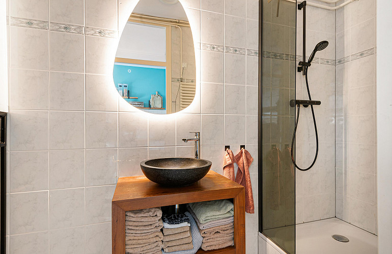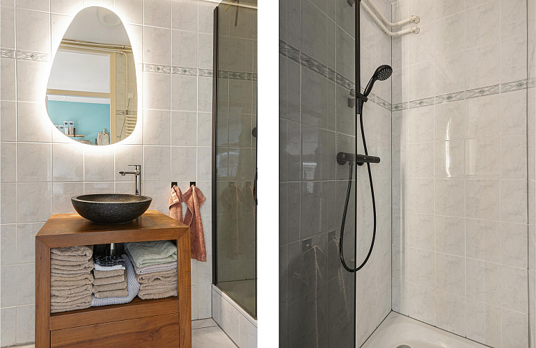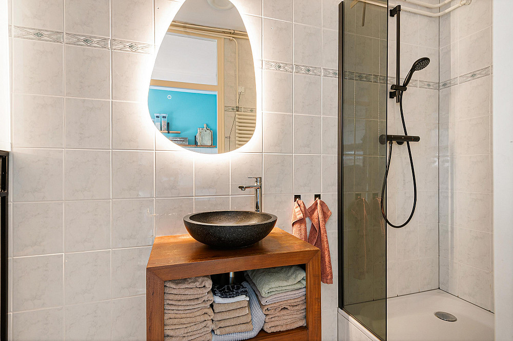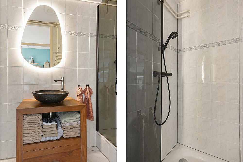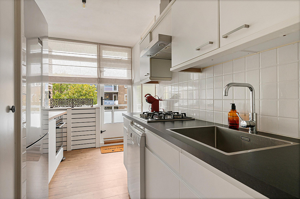 De keuken ligt direct naast de entree en biedt toegang tot de badkamer, voorzien van douche, wastafelmeubel en aansluiting voor de wasmachine.