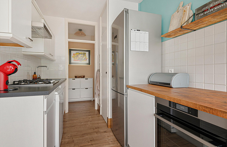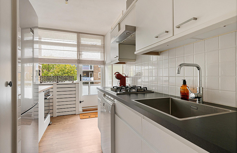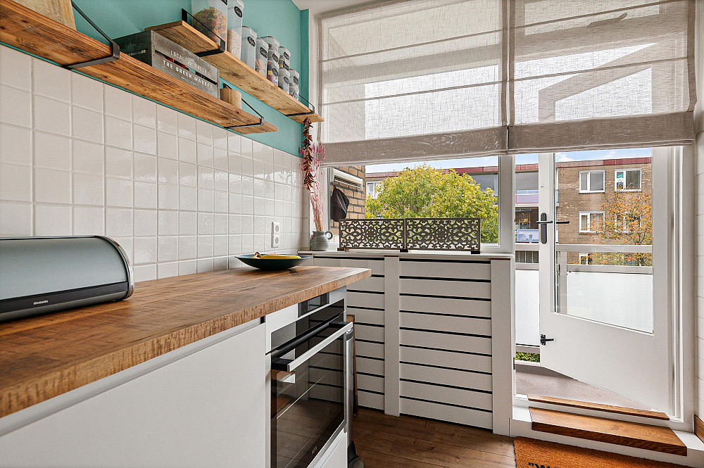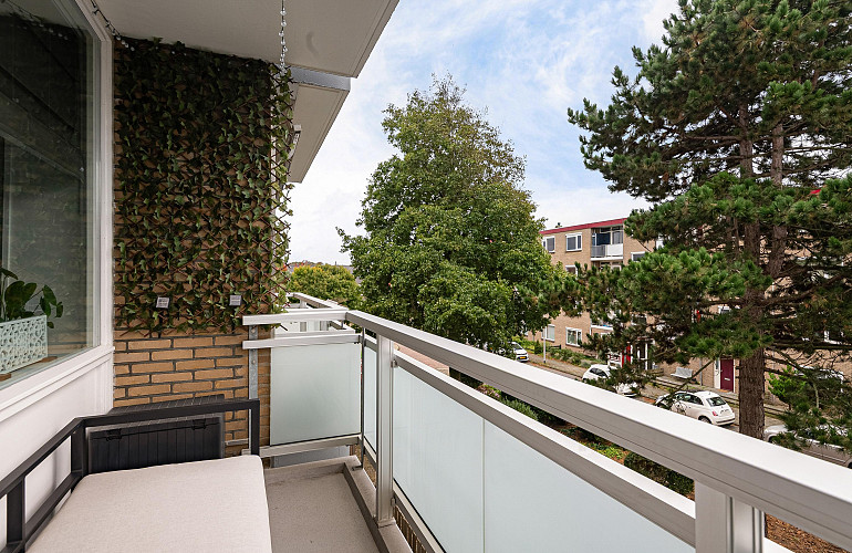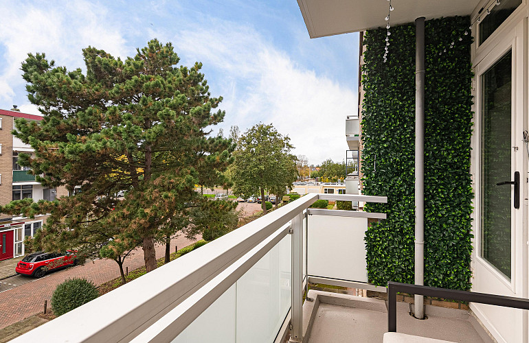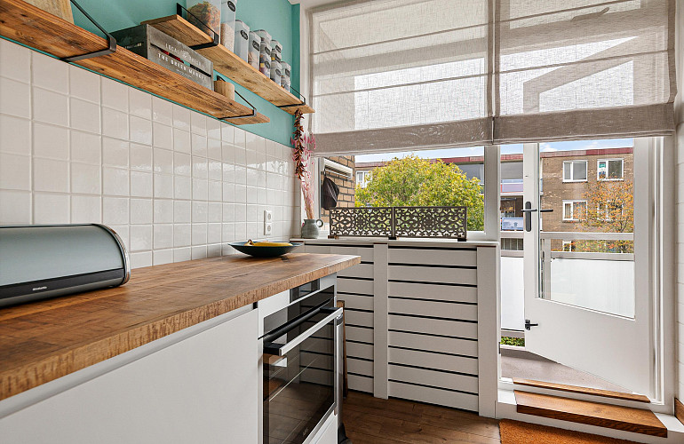 Het tweede balkon, dat grenst aan de keuken, beschikt over een aparte kast met de CV-installatie en is eveneens toegankelijk vanuit de keuken.