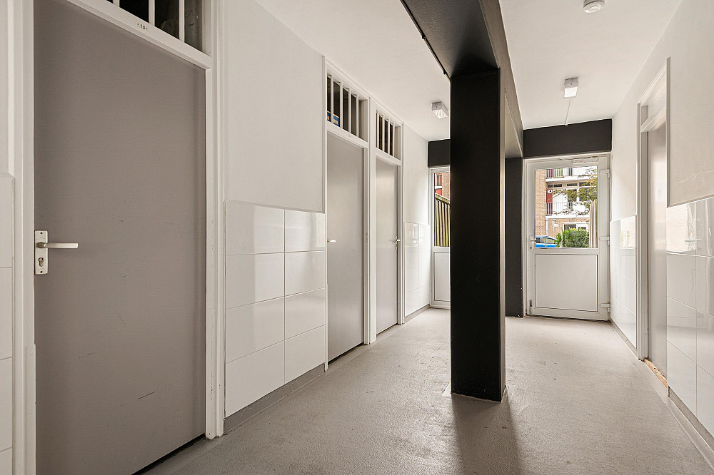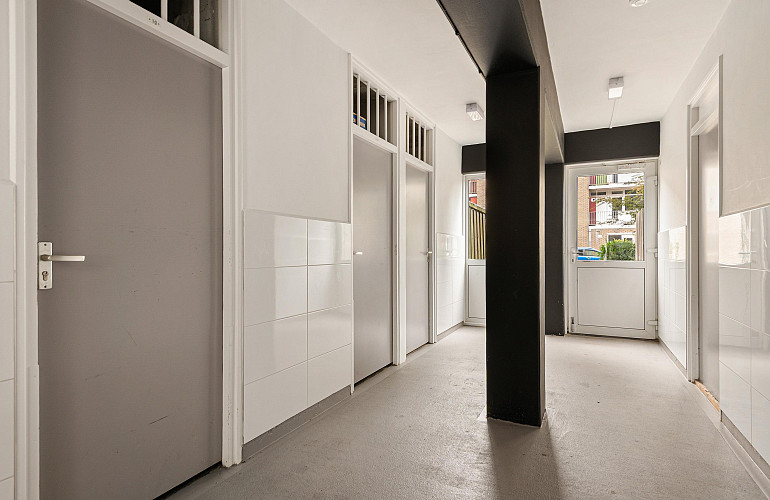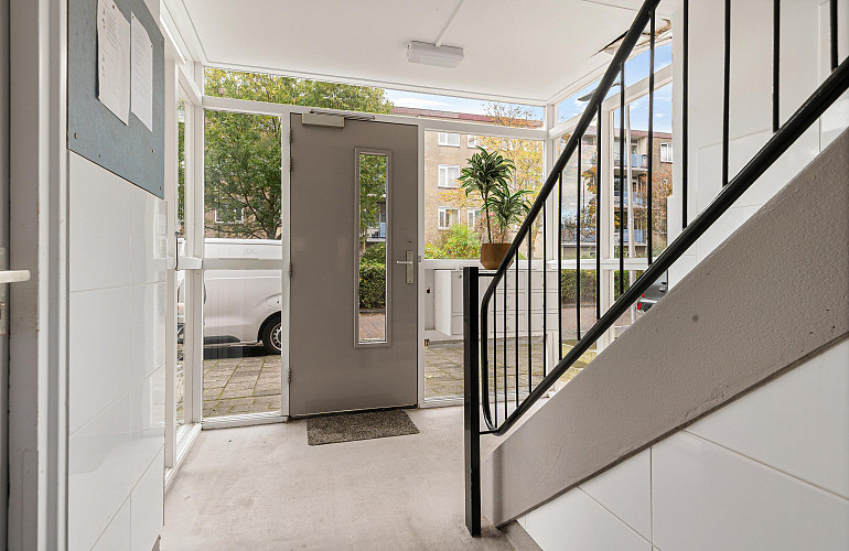 Afgesloten entree met brievenbussen, bellentableau en trapopgang naar de verdiepingen. Op de begane grond bevindt zich de eigen berging.