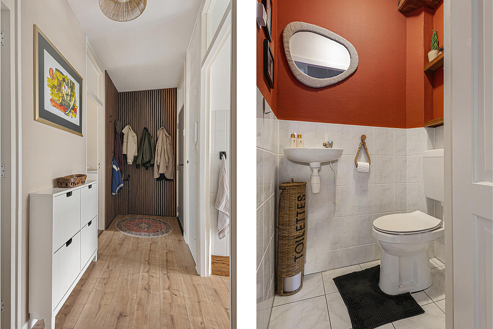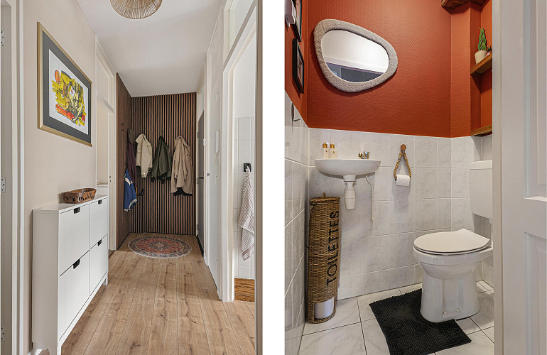 Entree woning, hal met garderobe, meterkast en toegang tot twee slaapkamers, de keuken, het toilet en de woonkamer.