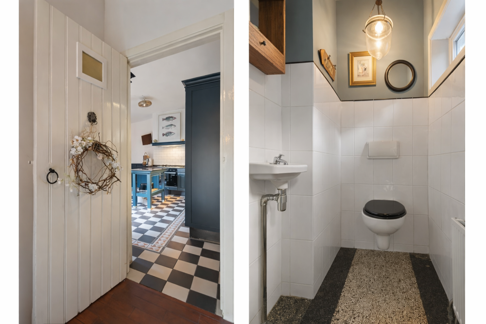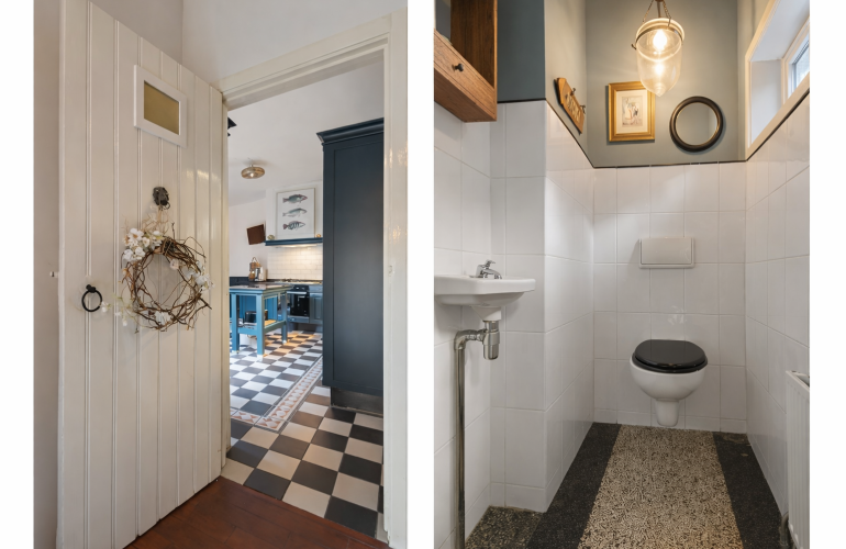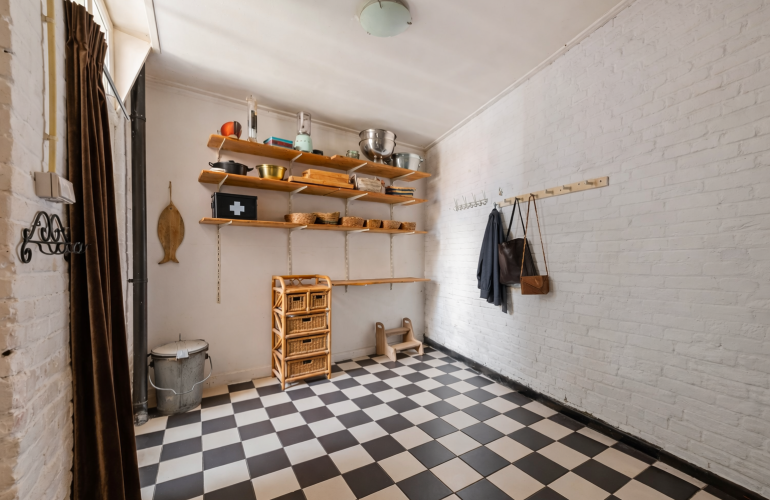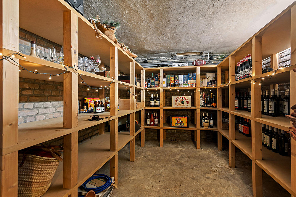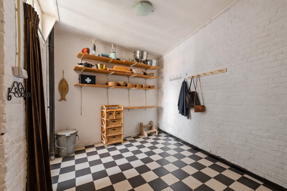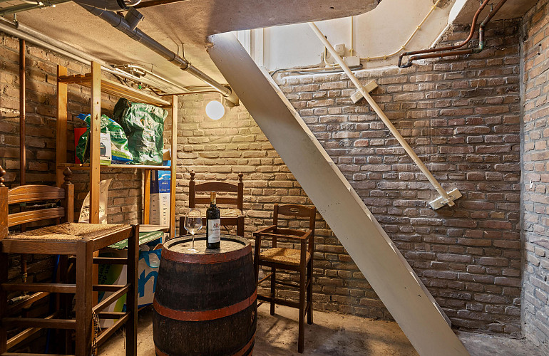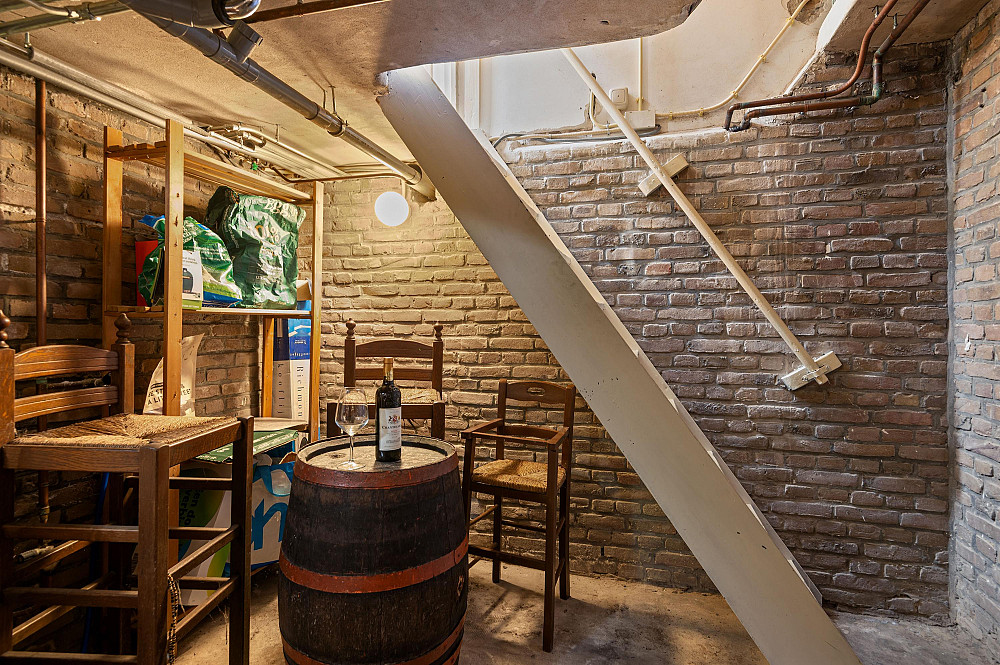 Vanuit de zitkamer zijn de toiletruimte, de kelder en de achteringang bereikbaar. De kelder is een praktische en sfeervolle ruimte, uitermate geschikt voor opslag en in het bijzonder ideaal voor wijnliefhebbers als provisie- of wijnkelder.