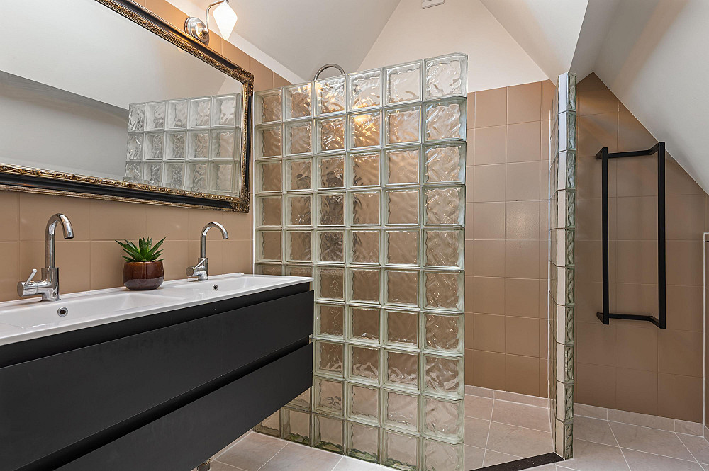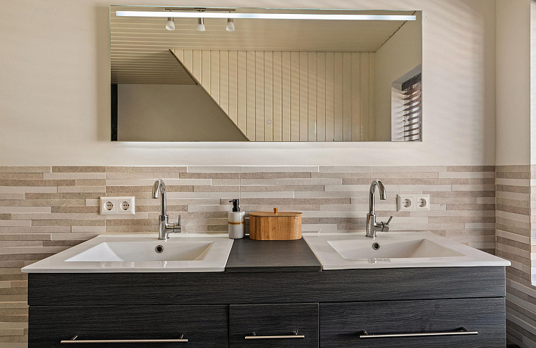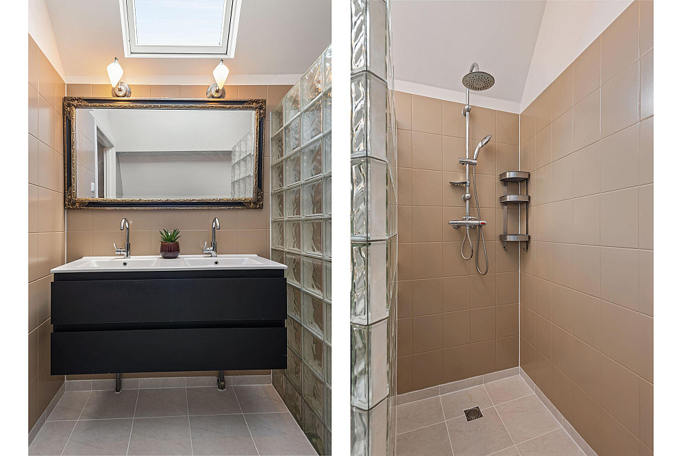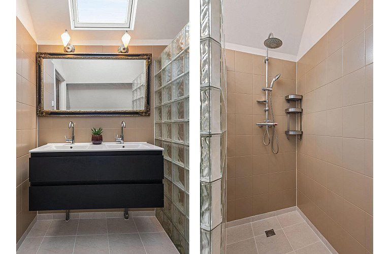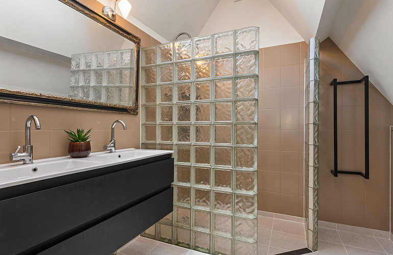 - Twee badkamers op de eerste verdieping waarvan één voorzien is van inloopdouche en ligbad, en een voorzien is van inloopdouche en toilet.
