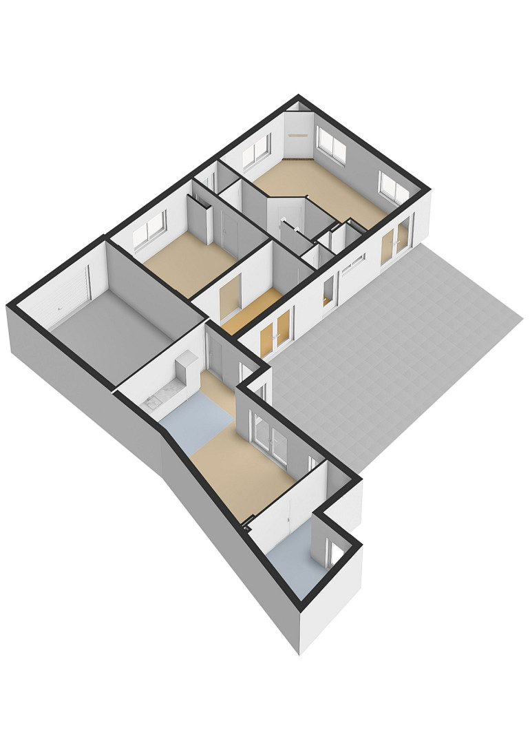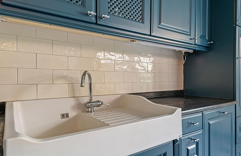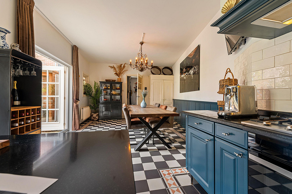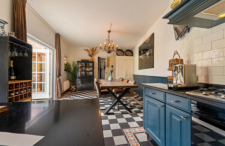 De open keuken bevindt zich aan de achterzijde van de woning en is uitgevoerd in een praktische L-opstelling met granieten werkblad en diverse inbouwapparatuur, waaronder een vaatwasser, koelkast, grote spoelbak, oven en gaskookplaat. De keuken en aangrenzende eetkamer vormen samen een ruim en prettig leefgedeelte van circa 30 m², de keuken is voorzien van vloerverwarming. Vanuit de eetkamer geven dubbele openslaande deuren toegang tot de patio-tuin, waar u in alle rust kunt genieten van het buitenleven.