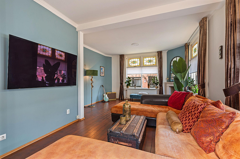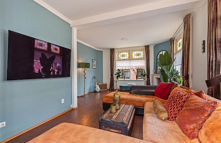 - Woonkamer ingericht als lounge-/TV-kamer met gashaard.