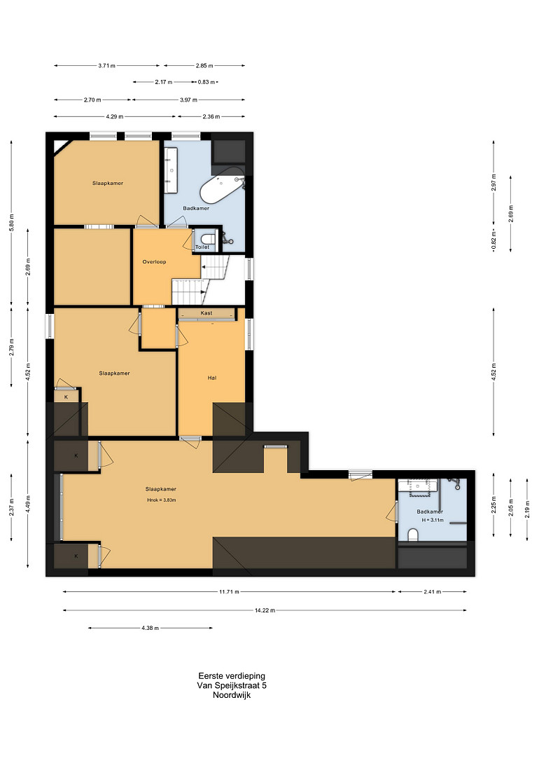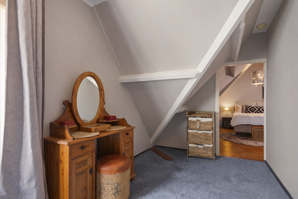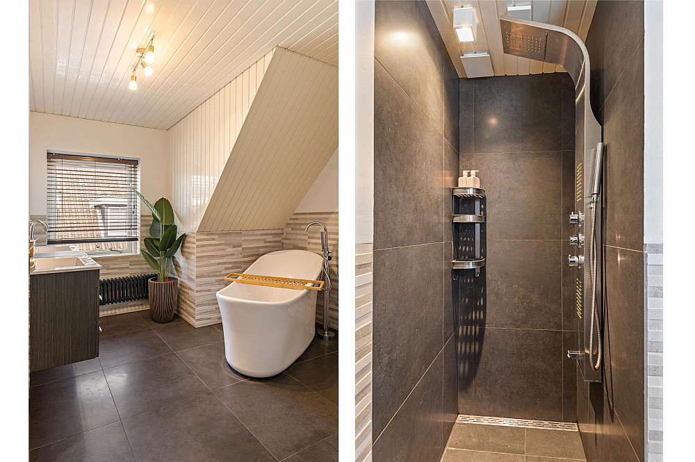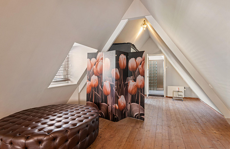 De recent gerenoveerde hoofdbadkamer (2023) is centraal op de verdieping gelegen, direct naast het separate toilet, en uitgerust met een vrijstaand ligbad, een inloopdouche en een dubbel wastafelmeubel. Verder beschikt deze verdieping over een separate kamer, momenteel ingericht als inloop kledingkamer met vaste kastenwand, maar tevens geschikt als volwaardige (slaap)kamer. Deze ruimte vormt de doorgang naar de hoofdslaapkamer. De hoofdslaapkamer is uitzonderlijk ruim opgezet, met inbouwkasten en heeft een vloeroppervlakte van circa 50 m². De ligging onder de kap zorgt door de schuine dakvlakken voor een karaktervolle en unieke ruimte! Deze kamer beschikt over een eigen badkamer en suite, voorzien van een inloopdouche, dubbele wastafel en toilet.
