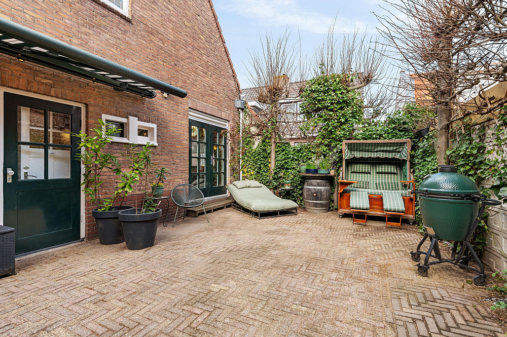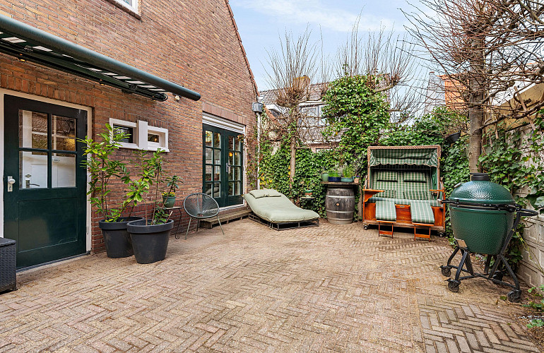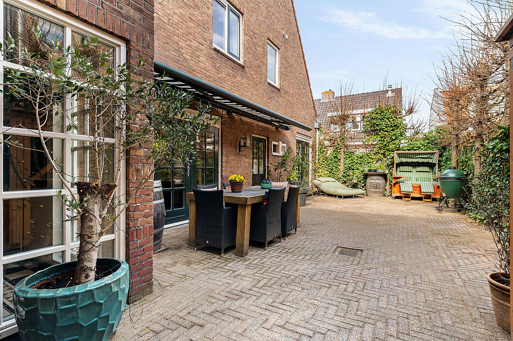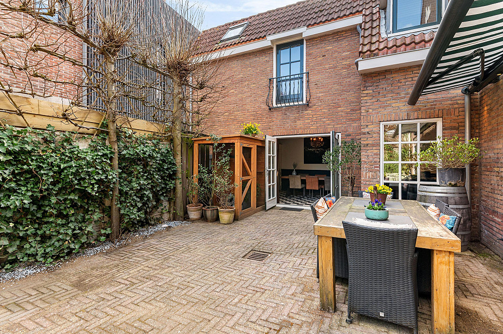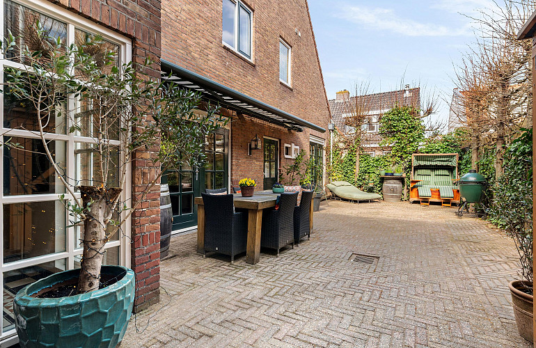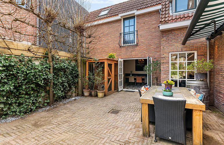 De besloten en zonnige achtertuin is fraai aangelegd en voelt als een rustige oase, met volop privacy dankzij de leilindes en groene erfafscheidingen. Een beschutte plek om in alle rust te genieten. De tuin is tevens bereikbaar via een praktische achterom.