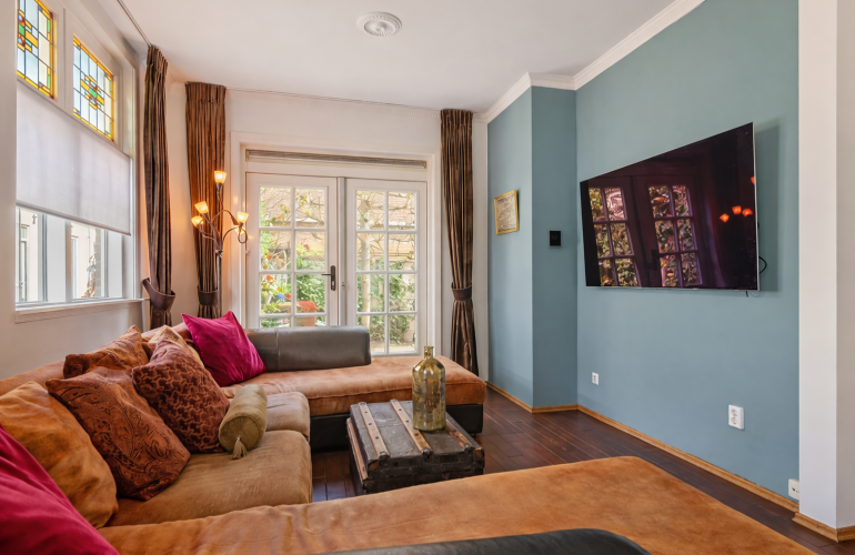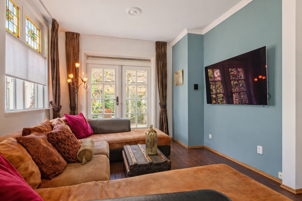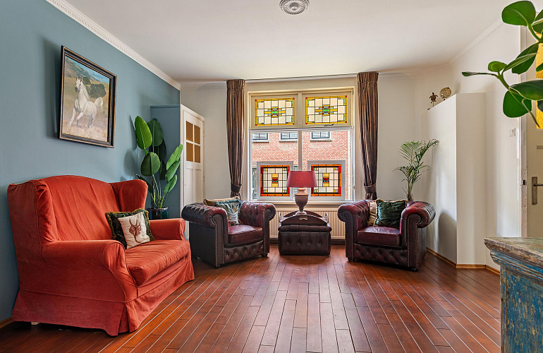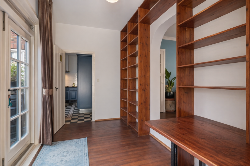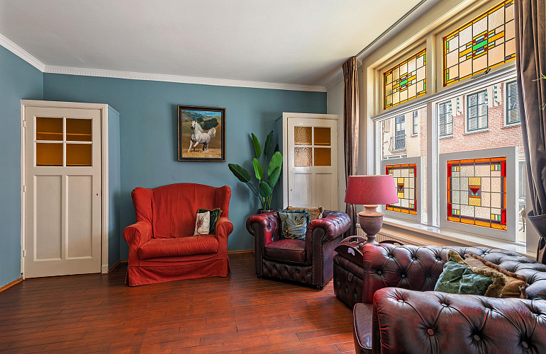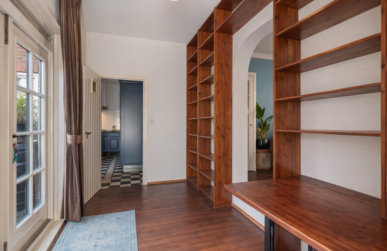 De zitkamer vormt samen met de aangrenzende ruimte met vaste kasten een royale leefruimte van circa 30 m². Vanuit deze ruimte is eveneens via dubbele openslaande deuren de patio-tuin bereikbaar. Beide kamers zijn afgewerkt met een fraaie parketvloer en kenmerken zich door hun karaktervolle uitstraling.