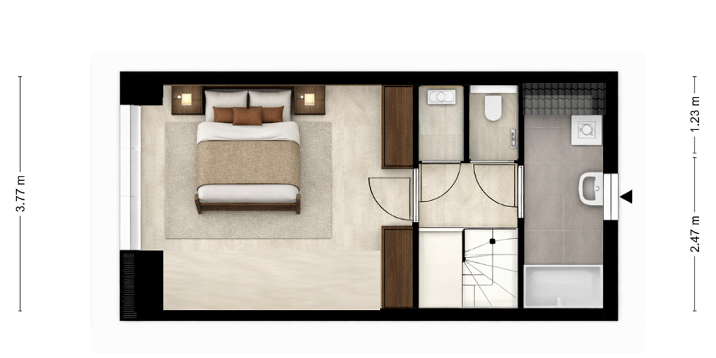 Compact maar efficiënt ingedeeld, met woonkamer en keuken beneden en slaapkamer en badkamer boven. Perfect voor starters of singles. Optioneel dakterras. Inclusief privéberging op de begane grond en eigen parkeerplaats. Alle woningen hebben op de verdieping nog een berging met C.V.-ketel.