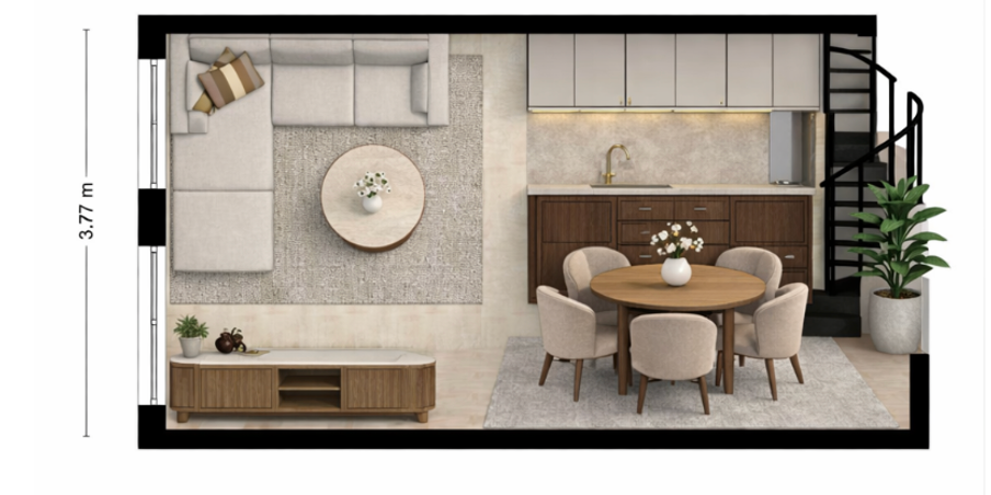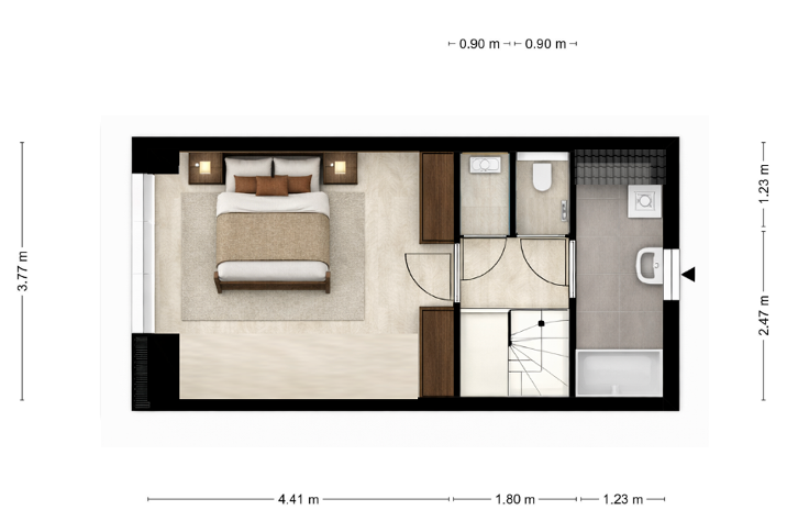 De grootste woning van het project, met een royale woonkamer met open keuken, privé-berging met C.V.-ketel en eigen terras gelegen op de eerste verdieping en een slaapkamer met badkamer boven. Inclusief privé-berging op de begane grond en eigen parkeerplaats.