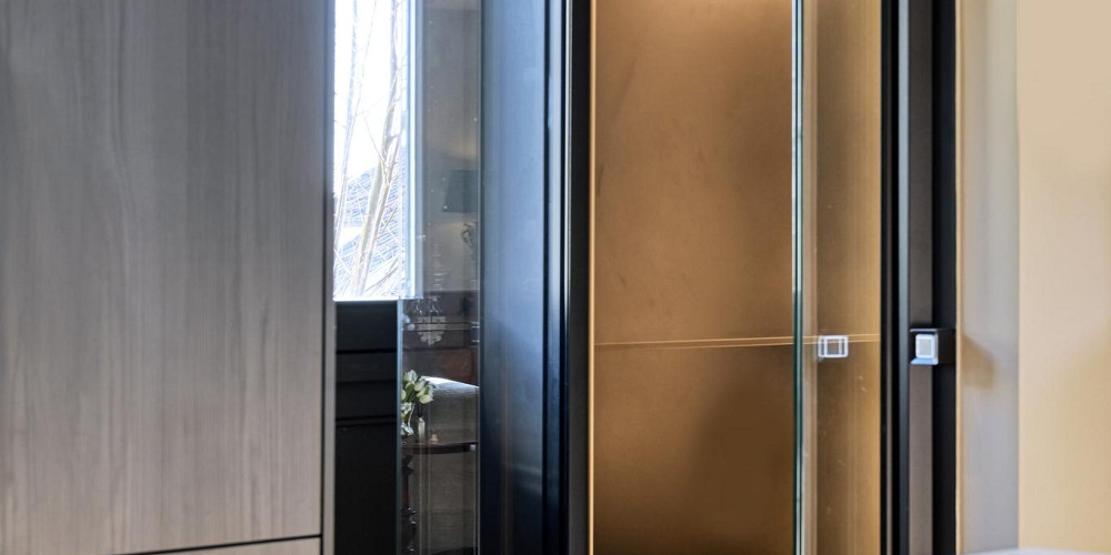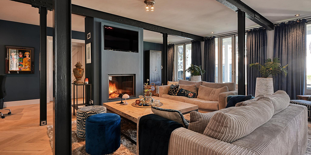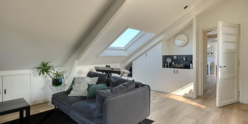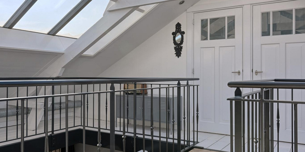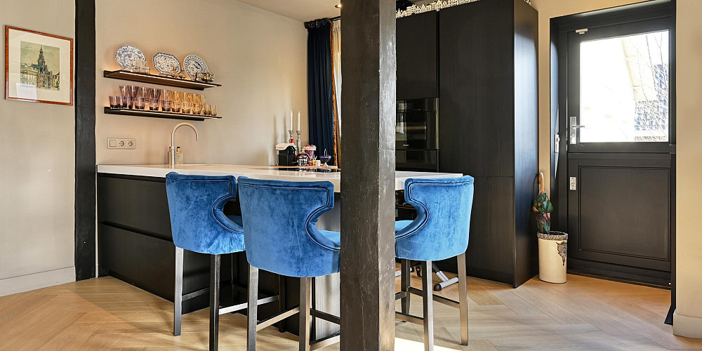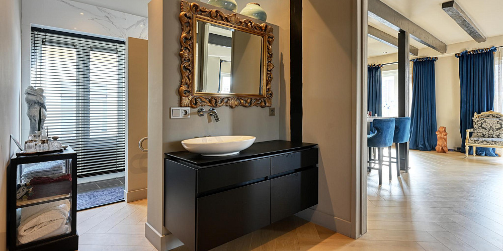 Aan de overzijde van de vide betreedt u het zelfstandige appartement met een woonoppervlakte van ca. 82 m2. Het is zowel binnendoor als buitenom bereikbaar en biedt veel mogelijkheden, bijvoorbeeld voor een inwonend familielid, als mantelzorgwoning, gastenverblijf/verblijf voor een au-pair of als kantoorruimte aan huis. Er is een eigen intercom en alarminstallatie aanwezig. Het appartement is in 2021 nieuw opgebouwd en heeft onder meer een woonkamer met een sfeervolle gas-openhaard, een moderne open keuken voorzien van inbouw apparatuur, een ruime slaapkamer met een kleedkamer/berging, een moderne badkamer met inloopdouche, toilet (Geberit Aqua Clean comfort) en zelfs een eigen liftinstallatie. De vloer van het appartement heeft een visgraat houten vloer met vloerverwarming.