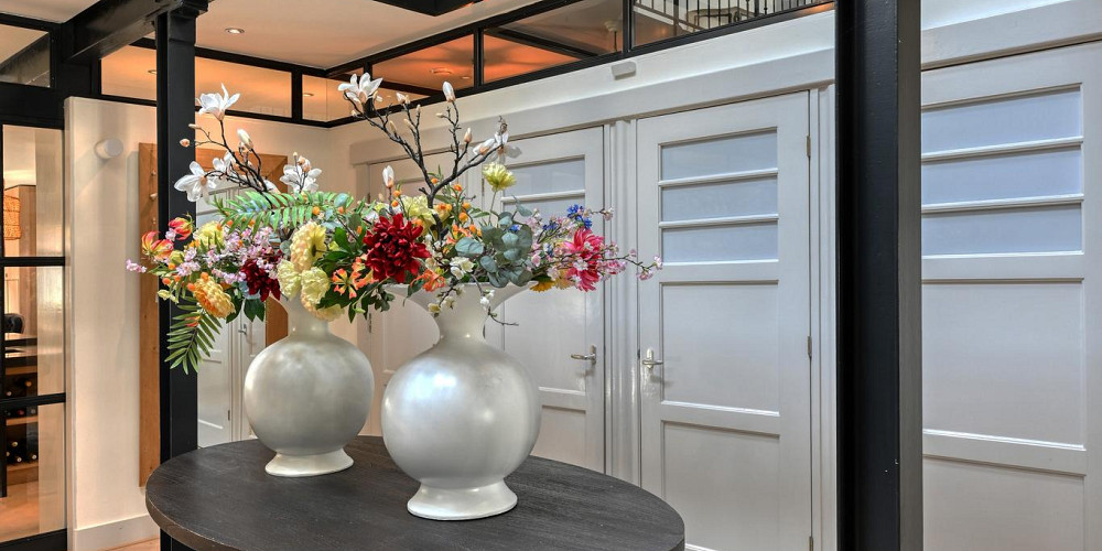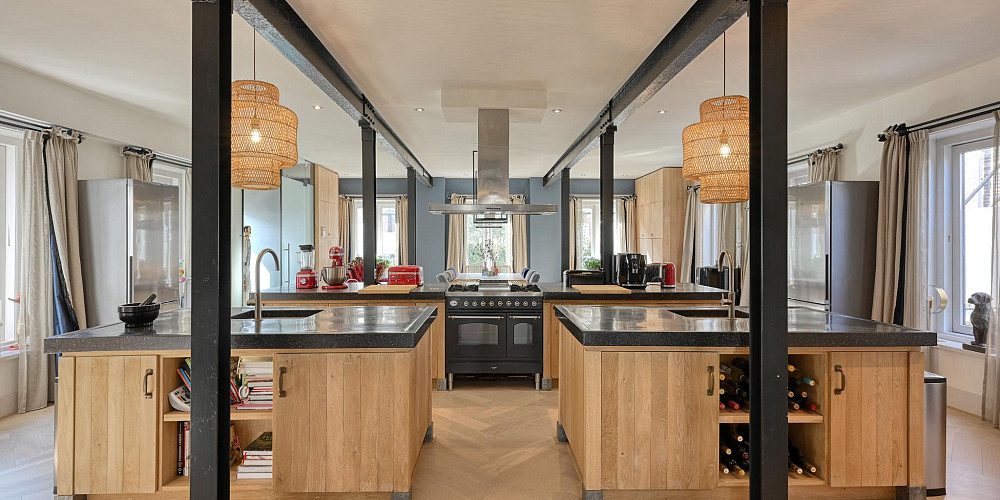 In de entree op de begane grond wordt u verwelkomt door een modern atrium en een prachtig trappenhuis. Links van de entree is de grote woonkeuken van ca. 80m2, die met een authentieke kachel de ideale ruimte biedt voor culinaire verkenningen. Het kookgedeelte is nagenoeg professioneel en alle mogelijke apparatuur is aanwezig, waaronder een Boretti-fornuis met dubbele oven. Deze gezellige plek leent zich prima voor het geven van kookworkshops of uitgebreid koken door de thuiskok.