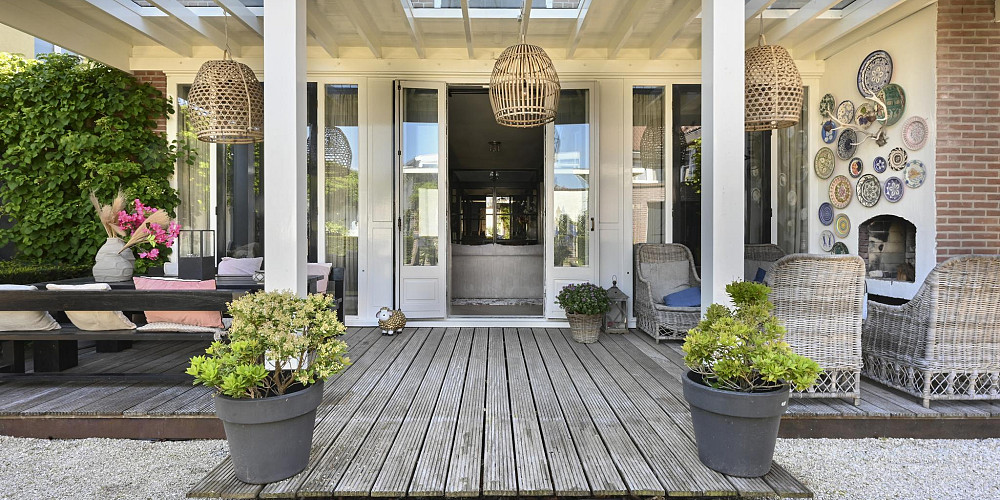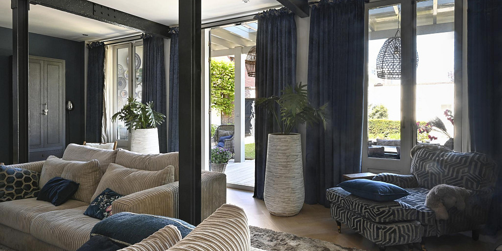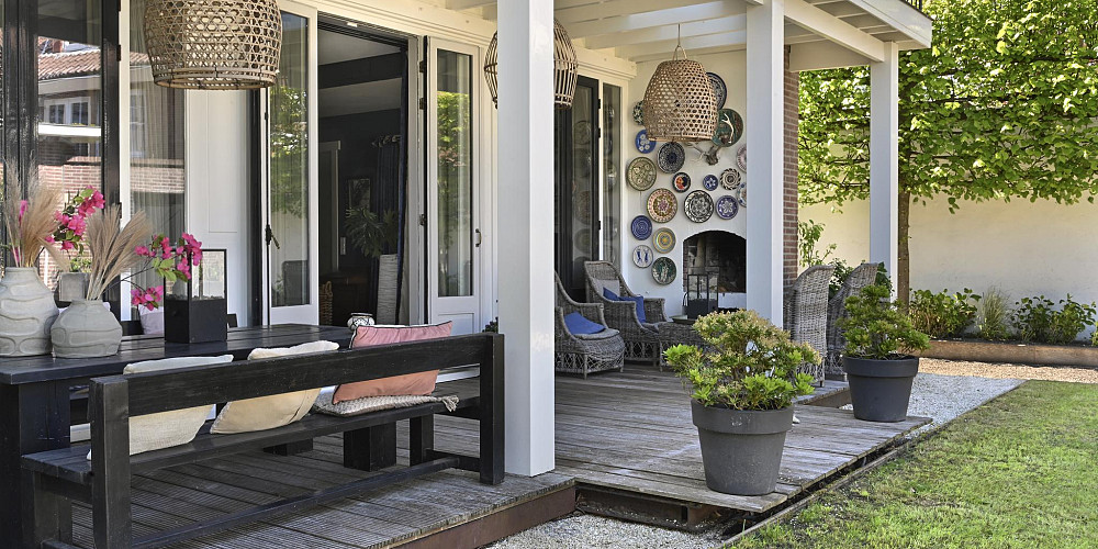 De woonkamer (ca. 60 m2) aan de achterzijde van het huis met zijn sfeervolle houtgestookte openhaard, leidt u via drie openslaande deuren naar een veranda en een zonnige, beschutte tuin waar u heerlijk kunt ontspannen bij de buiten openhaard. De gehele begane grond van de woning heeft een visgraat houten vloer.