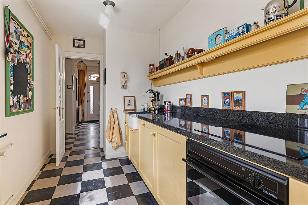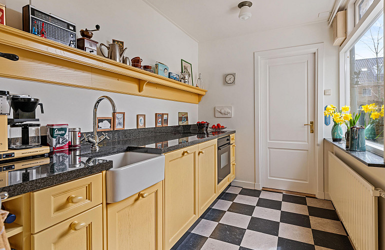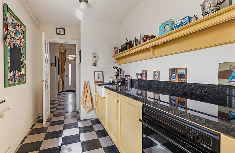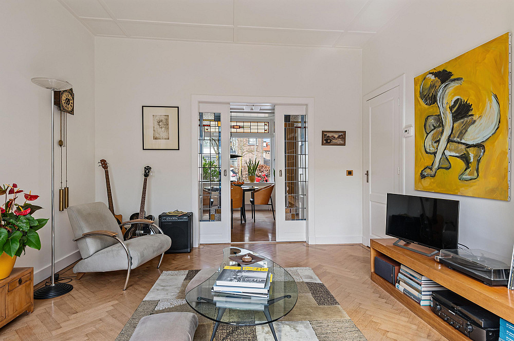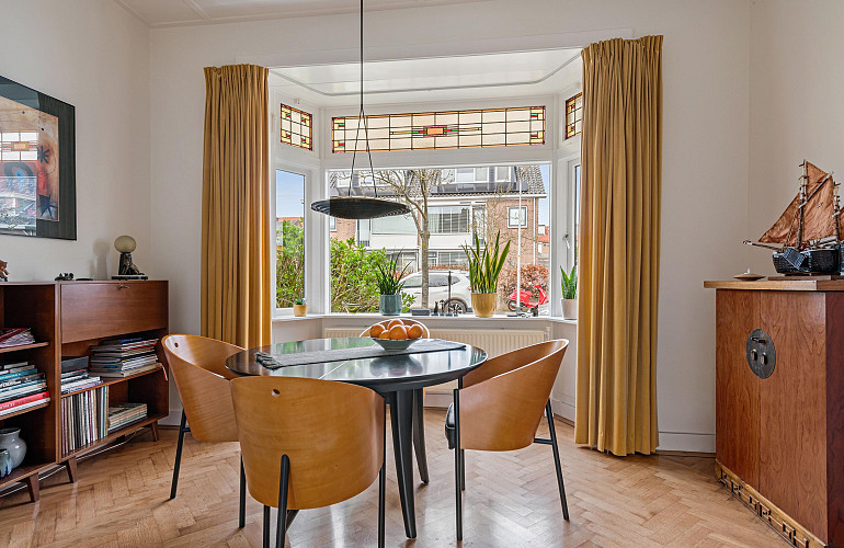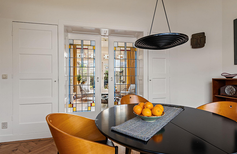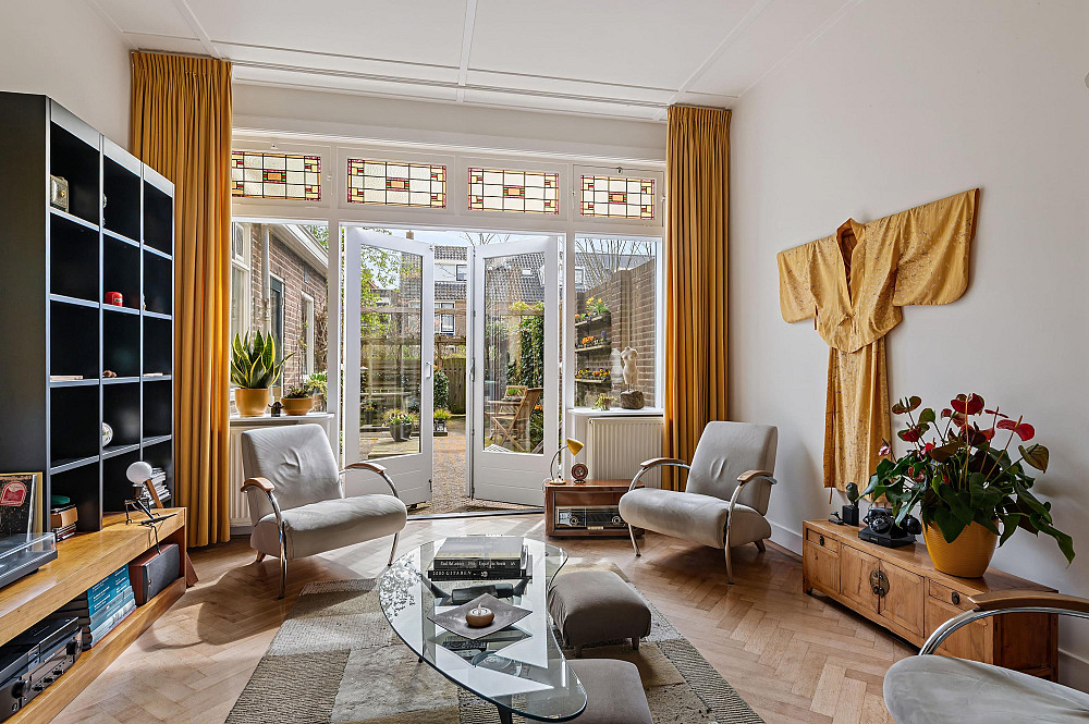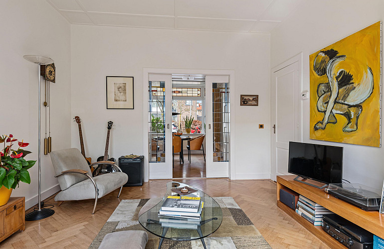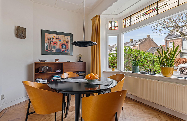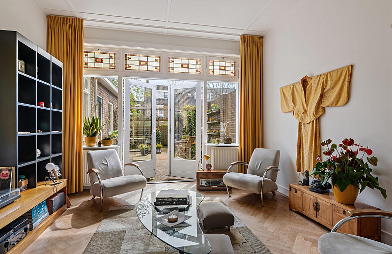 De woon- en eetkamer vormen een sfeervolle kamer-en-suite van ca. 30 m², gescheiden door originele glas-in-lood schuifdeuren. Aan de voorzijde bevindt zich de eetkamer met erker en glas-in-lood bovenlichten. Aan de achterzijde ligt de woonkamer met openslaande deuren naar de tuin, waardoor binnen en buiten op natuurlijke wijze in elkaar overlopen. De begane grond is afgewerkt met een visgraat parketvloer en is in 2023 volledig geschilderd. De keuken bevindt zich aan de achterzijde en betreft een handgemaakte keuken met een granieten werkblad en een tijdloze uitstraling. De keuken is voorzien van een inductiekookplaat, oven, koelkast en spoelbak met mengkraan en biedt directe toegang tot de tuin en de berging.