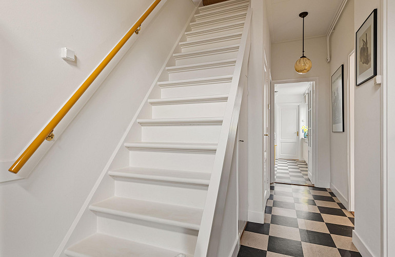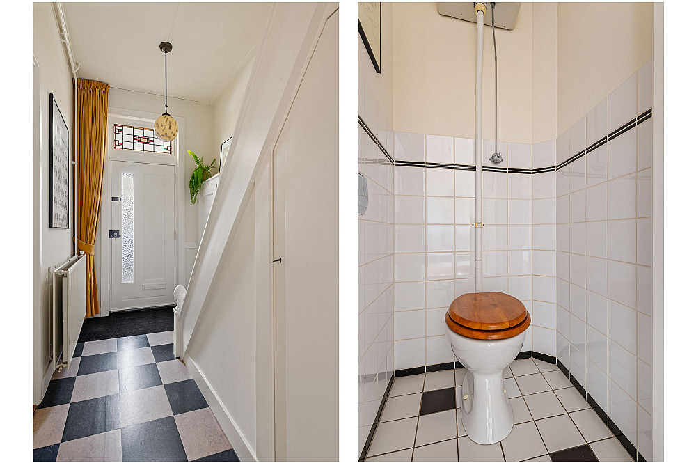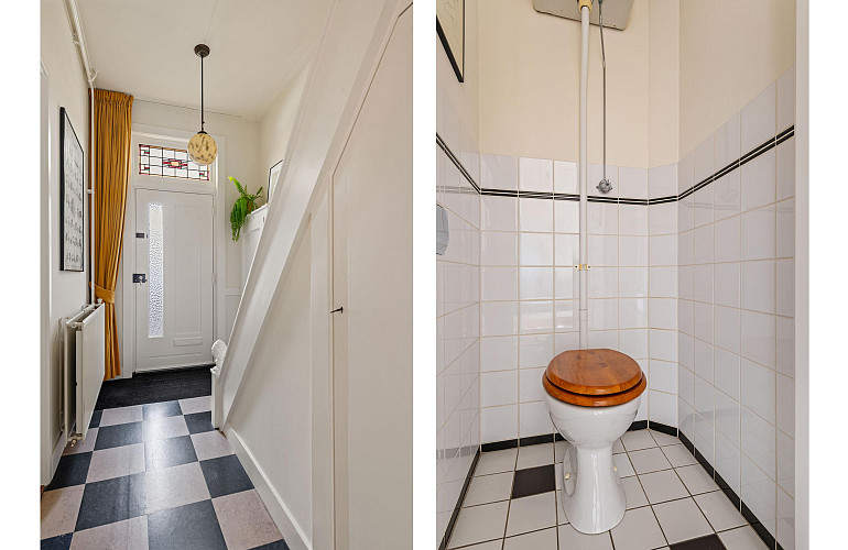 Entree met hal voorzien van een karakteristieke zwart-witte tegelvloer, trapopgang, toilet en een ruime garderobe (voormalige doucheruimte).