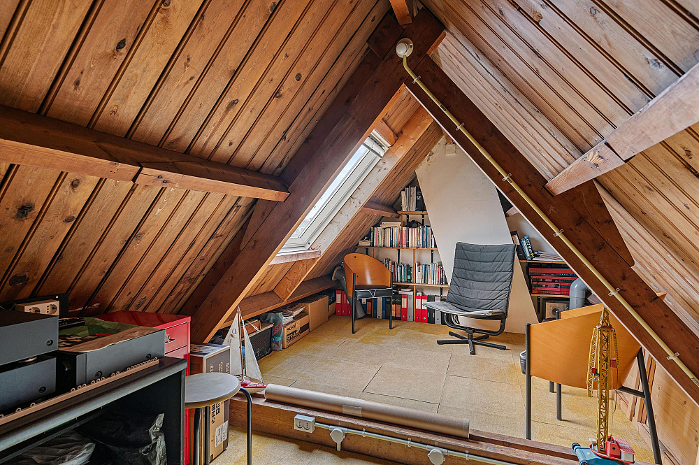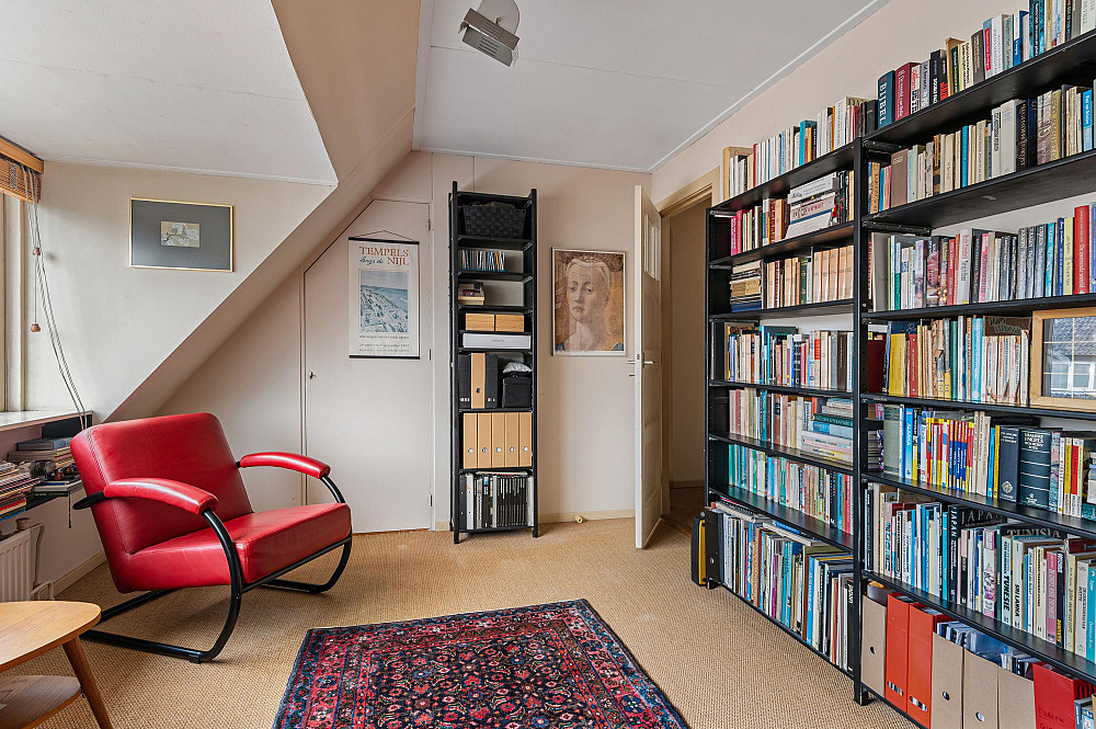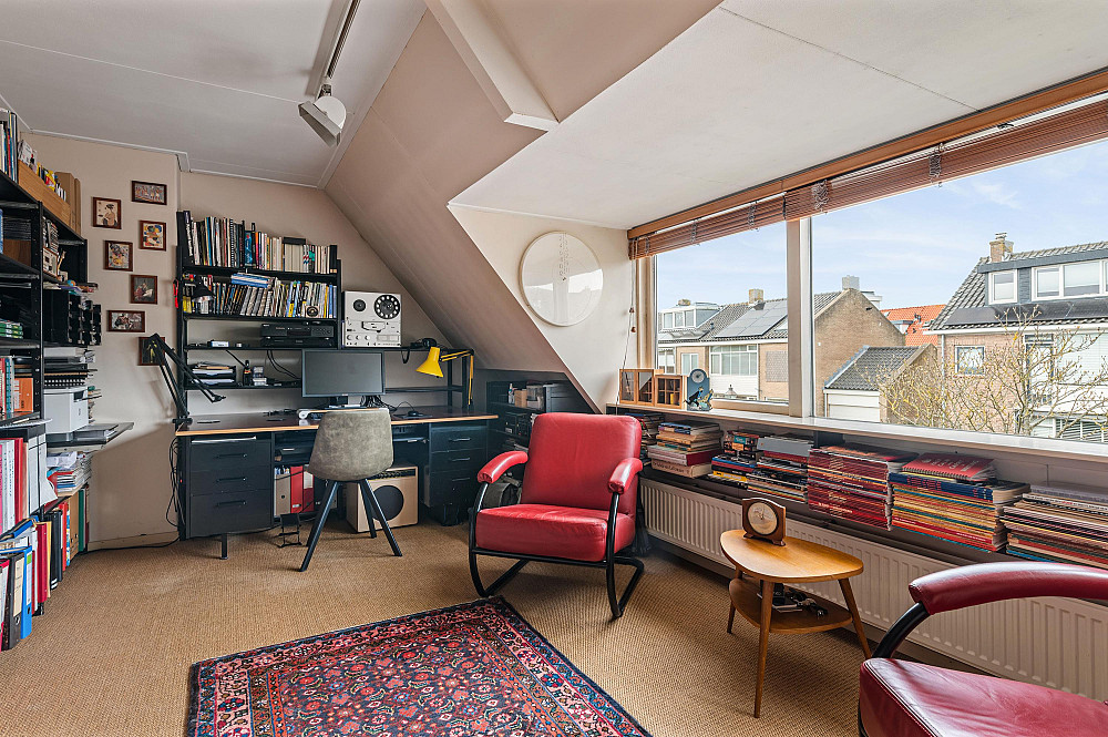 Zolderverdieping met daglicht via een dakraam en een schuine kap. Deze ruimte biedt mogelijkheden voor het realiseren van een extra (slaap)kamer, werkruimte of bergruimte.